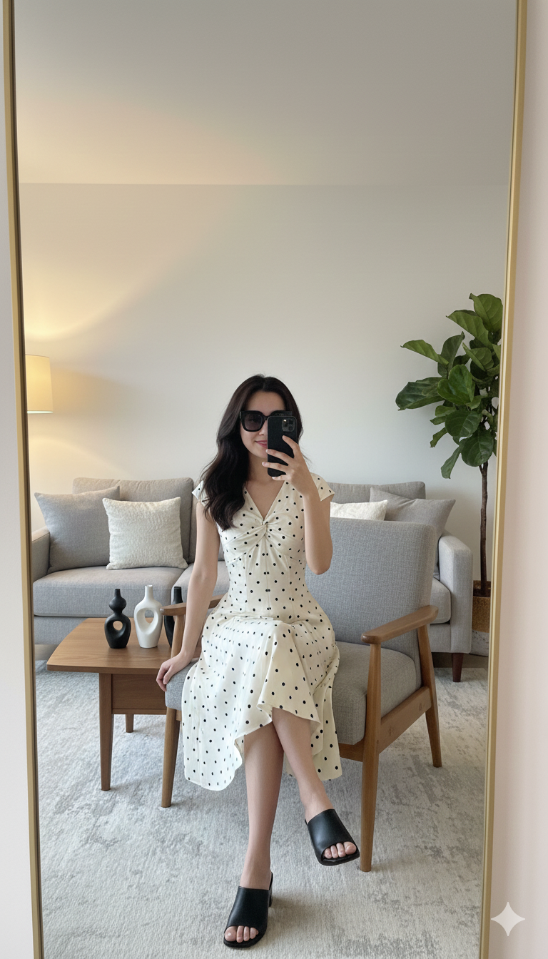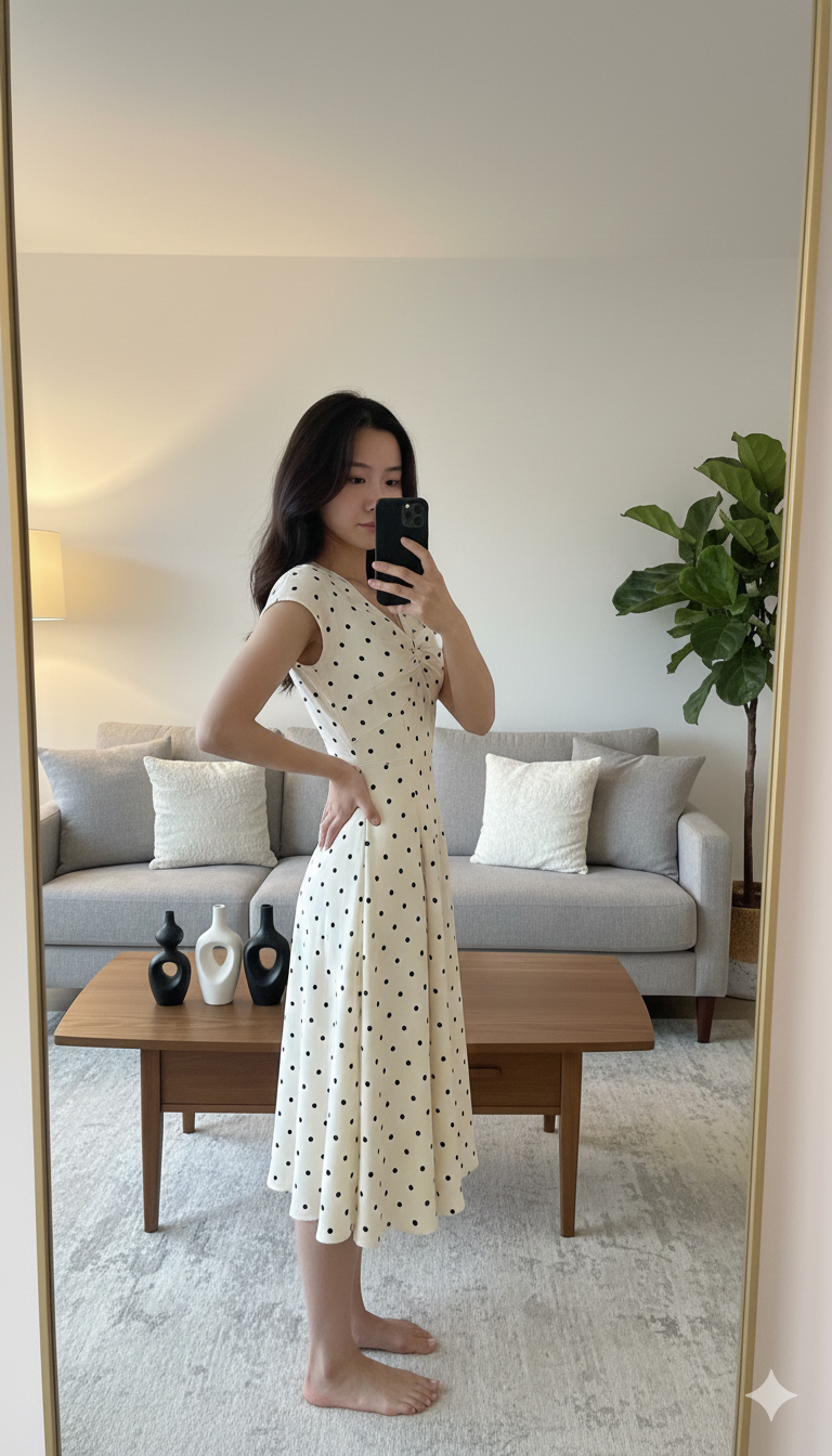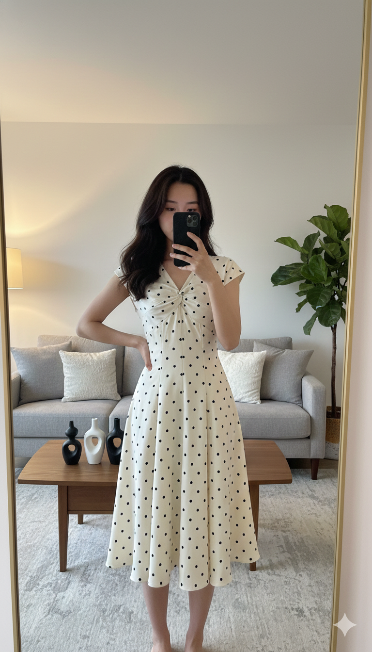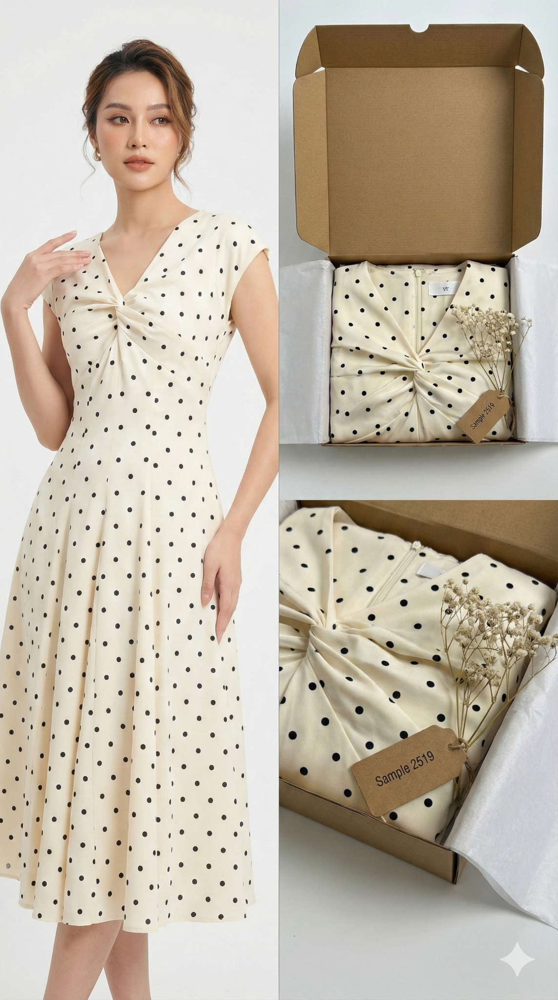 Đầm midi chấm bi với nền kem thanh lịch, hoạ tiết bi đen kinh điển mang lại cảm giác vừa cổ điển vừa hiện đại. Thiết kế cổ V nhún xoắn trước ngực tạo hiệu ứng vòng 1 đầy và tôn rõ vòng eo, phần tay chồm kín đáo giúp che nhẹ bắp tay. Từ eo trở xuống, chân váy xoè mềm dáng A, dài qua gối nên che khuyết điểm hông đùi rất tốt và vẫn dễ di chuyển. Chất vải rũ nhẹ, mặc mát, phù hợp từ đi làm, cafe, hẹn hò đến dạo phố cuối tuần; chỉ cần phối cùng sandal quai mảnh hoặc giày búp bê là đã có ngay outfit nữ tính, sang mà vẫn rất dễ gần.
