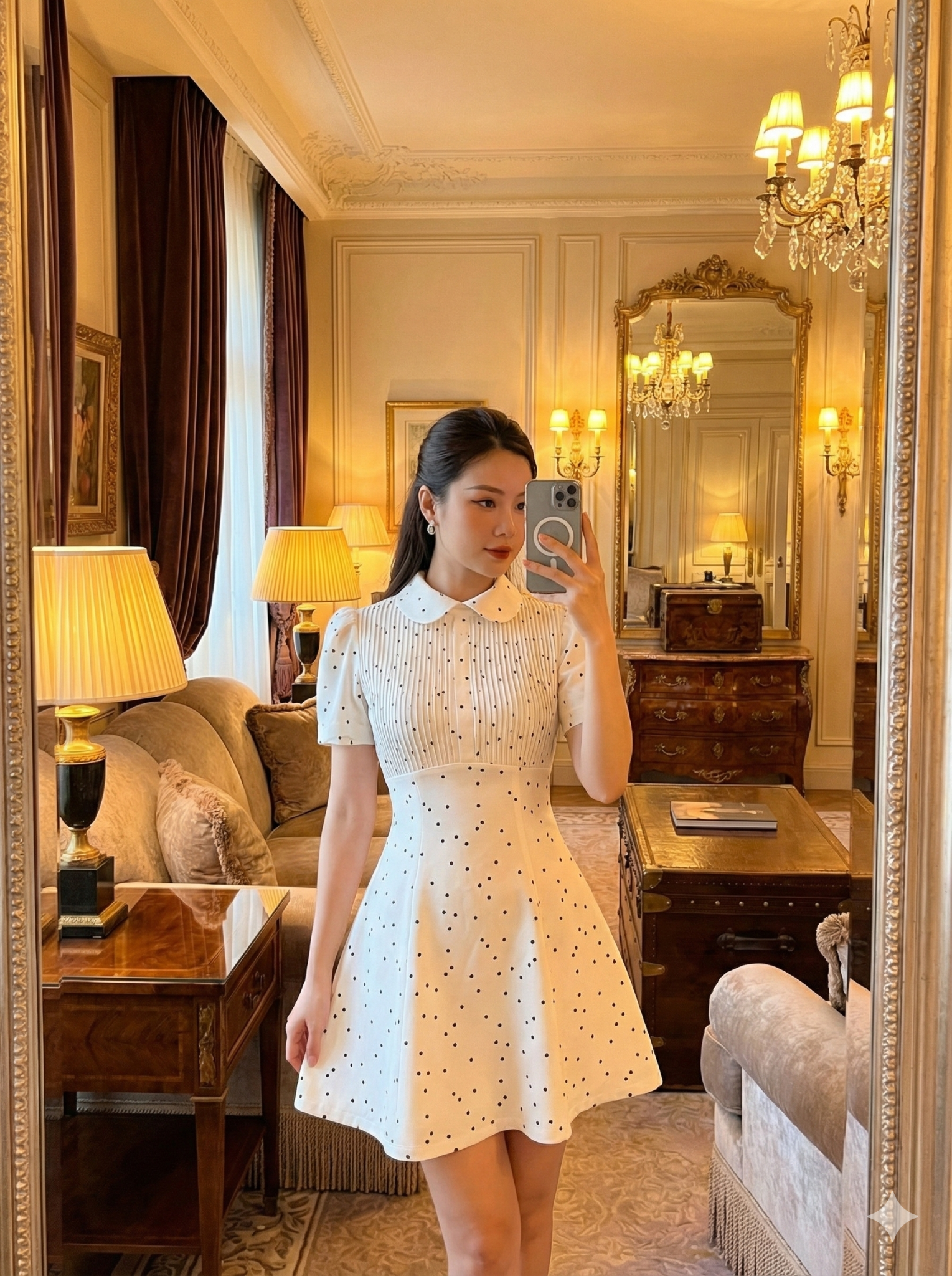 Đầm chấm bi cổ búp bê với phom xoè ngắn trẻ trung, dễ thương nhưng vẫn rất gọn gàng. Phần thân trên được xếp ly dọc tinh tế, phối tay phồng nhẹ giúp che khéo bắp tay và tôn bờ vai. Cổ búp bê tròn kín đáo, nền vải trắng điểm chấm bi đen nhỏ tạo cảm giác vừa vintage vừa hiện đại. Chân váy xoè vừa phải, bước đi có độ bay nhẹ, phù hợp mặc đi làm môi trường sáng tạo, đi cafe, dạo phố hay hẹn hò cuối tuần. Chỉ cần phối cùng giày búp bê hoặc sandal là đã có ngay outfit “xinh như nữ sinh nhưng vẫn rất thanh lịch”.
