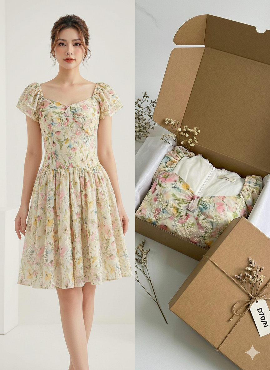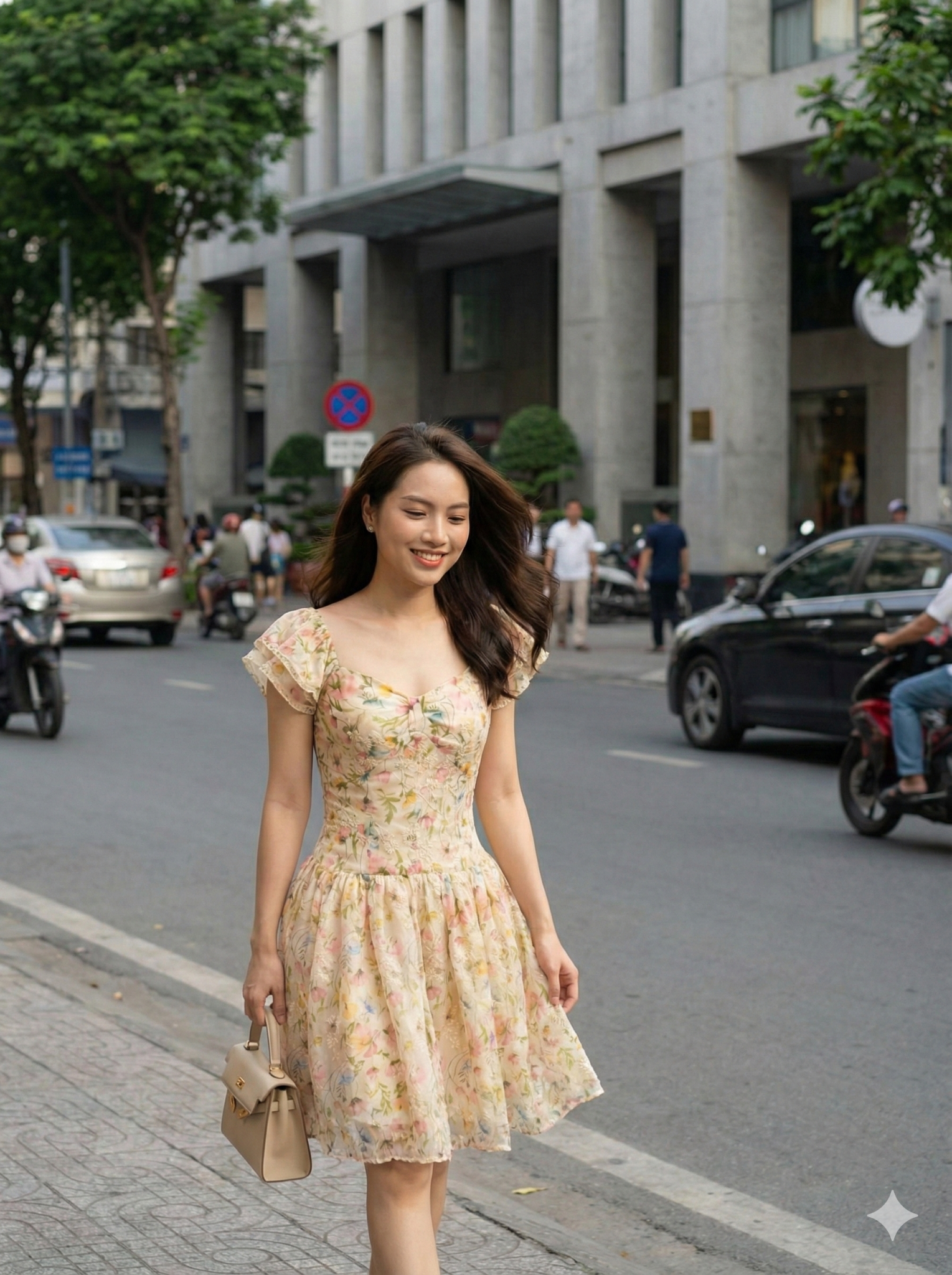 Đầm hoa dáng xoè với nền vàng kem in hoa pastel mang lại cảm giác trong trẻo, đúng kiểu “nàng thơ thành phố”. Thiết kế cổ tim nhún nhẹ tôn vòng 1, tay bèo rủ che khéo phần vai – bắp tay mà vẫn rất mát mẻ. Thân trên ôm vừa, chiết eo rõ rồi xoè bồng ở chân váy nhún, giúp vòng eo trông nhỏ hơn và tạo độ bay khi bước đi. Chất vải voan mỏng có lót, nhẹ và mềm, rất hợp mặc đi cafe, hẹn hò, dạo phố hay du lịch; chỉ cần phối cùng túi xách nhỏ và sandal là đã có ngay một set đồ nữ tính, tươi tắn cả ngày.