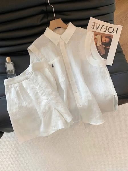KS0773-Set linen, áo phối túi thêu ngựa, quần short Trắng