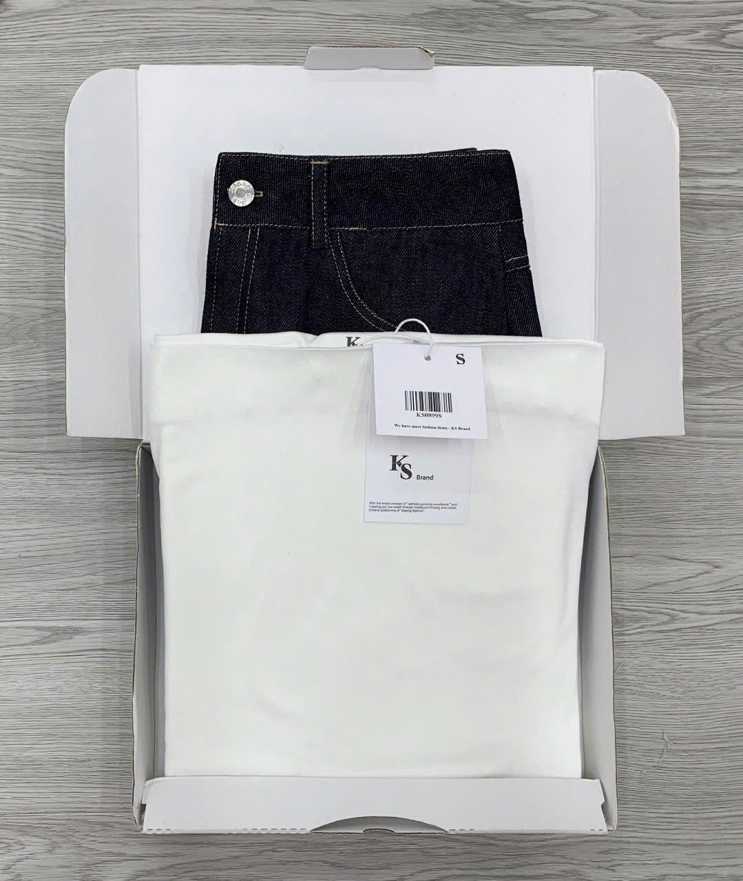 KS0899-Set áo bệt vai, quần short Jean (áo trắng)