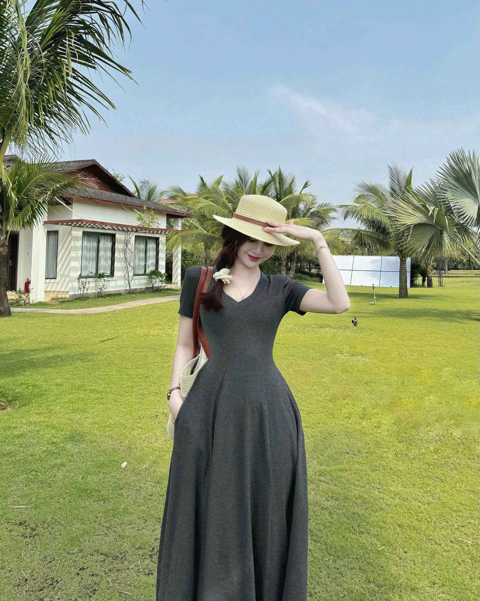KS0936 - ĐẦM THUN BORIP COTTON CỔ TIM DÀI XÁM