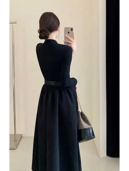 KS1695 - ĐẦM CỔ V TÙNG XÒE - KÈM NỊT (ĐEN)