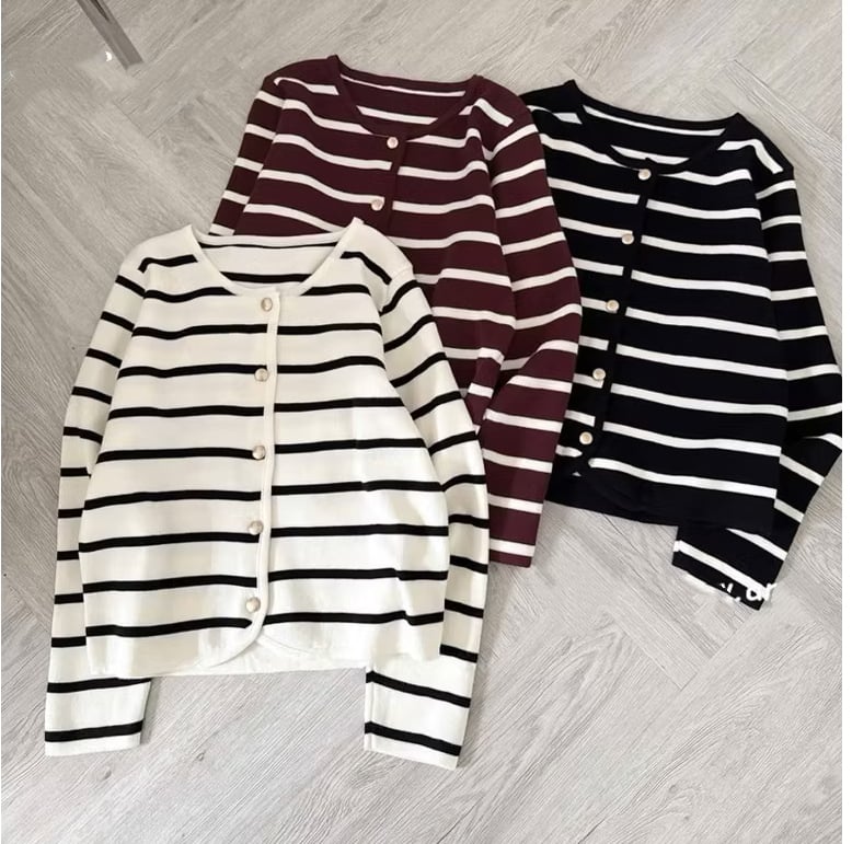 LEN4065 CARDIGAN LEN SỌC NÚT ĐỒNG (KEM)