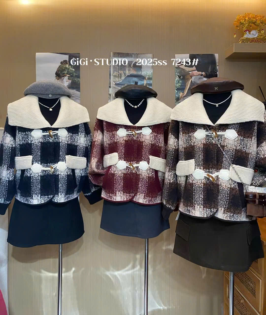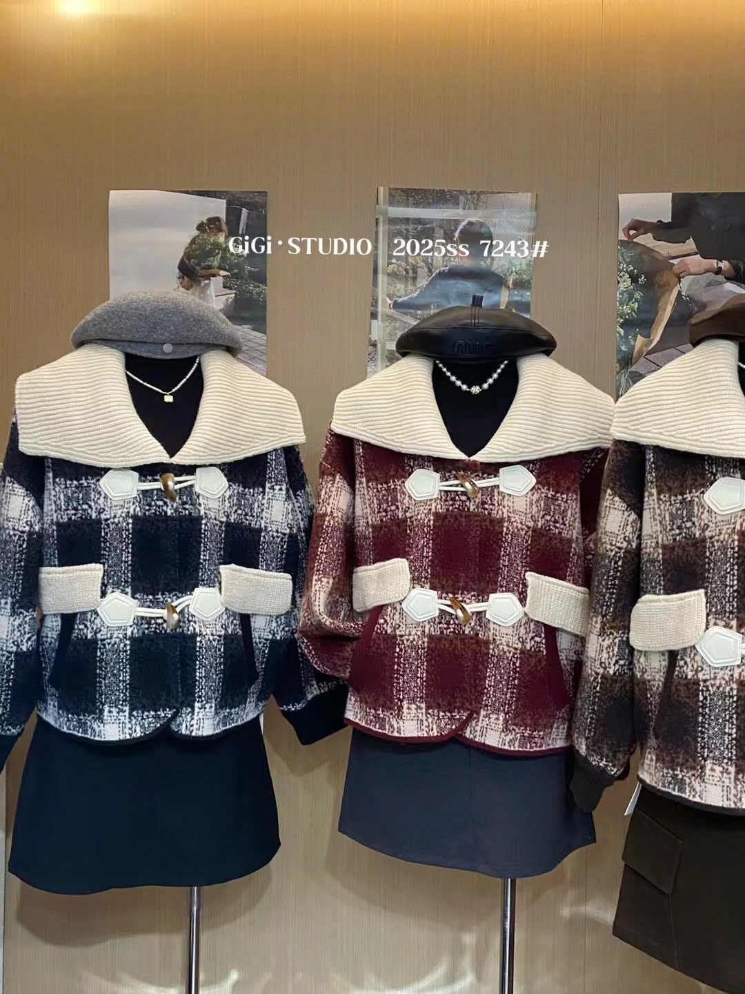 LEN5426 KHOÁC DẠ ÉP CARO CỔ PHỐI LEN (ĐEN) 7243