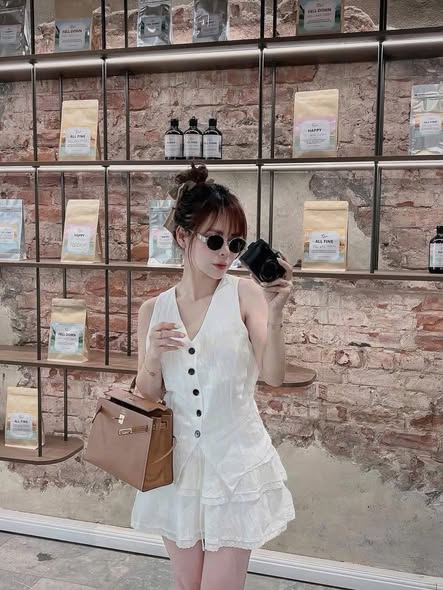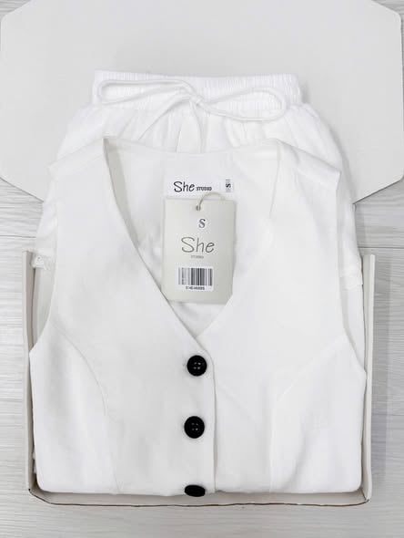 SHE4689 - SET ÁO GILE PHỐI NÚT, CHÂN VÁY NGẮN TẦNG (TRẮNG)