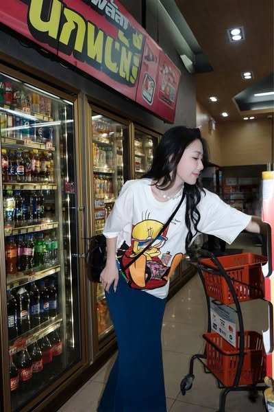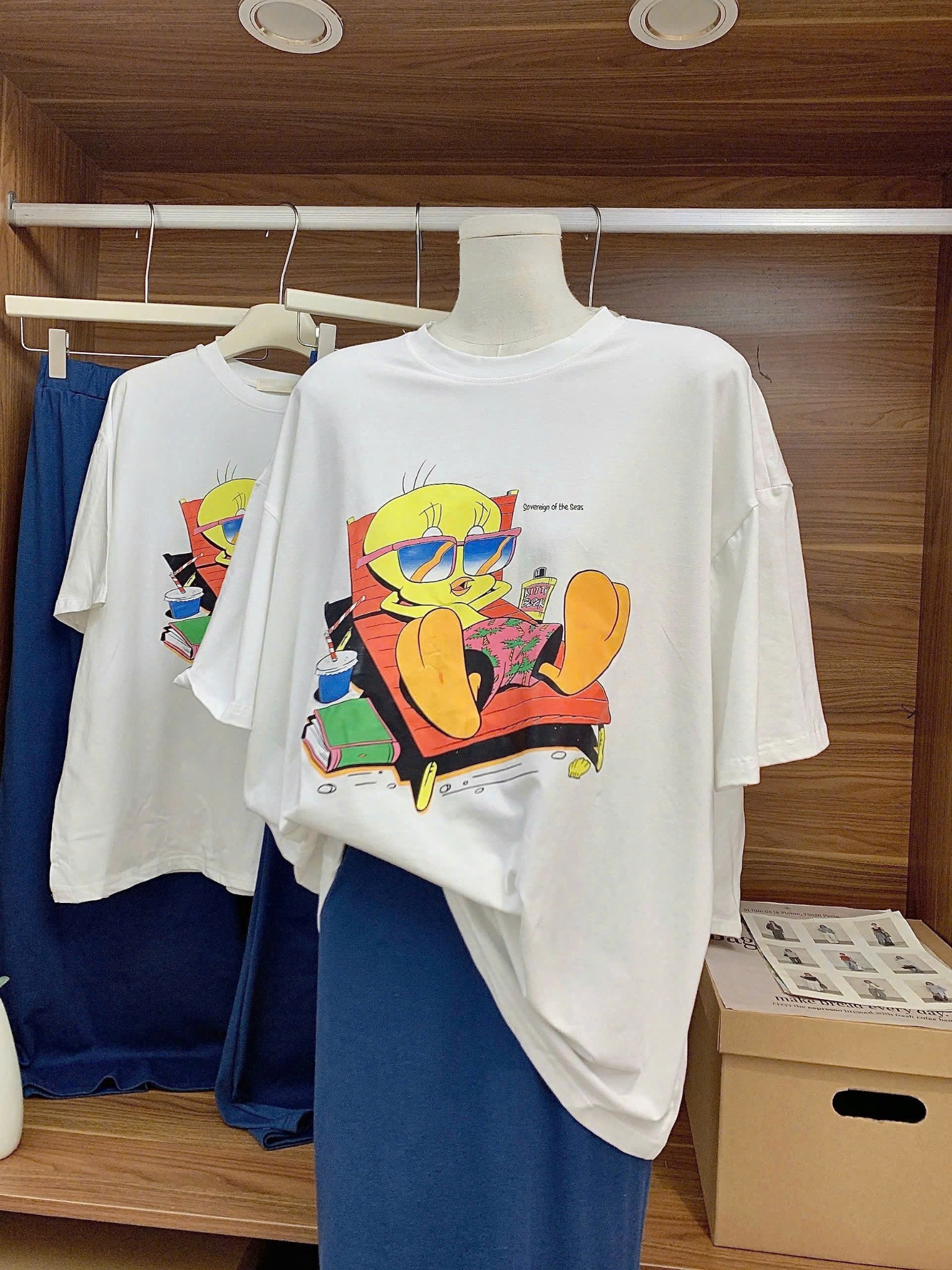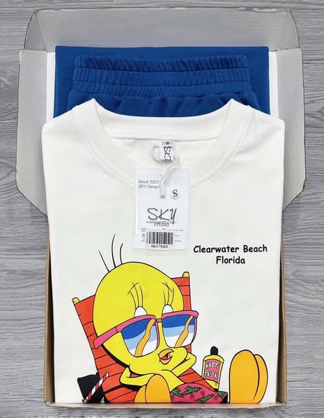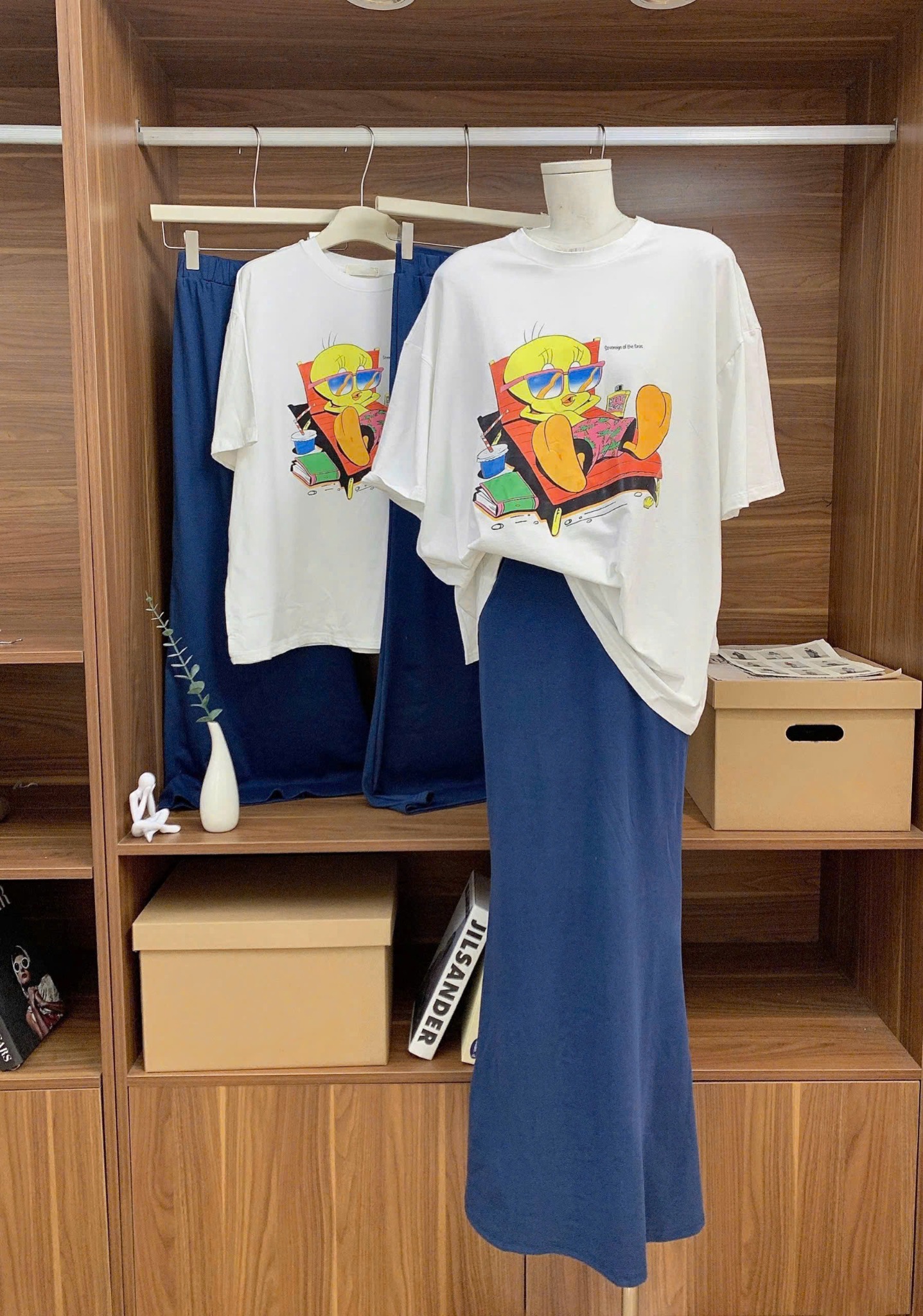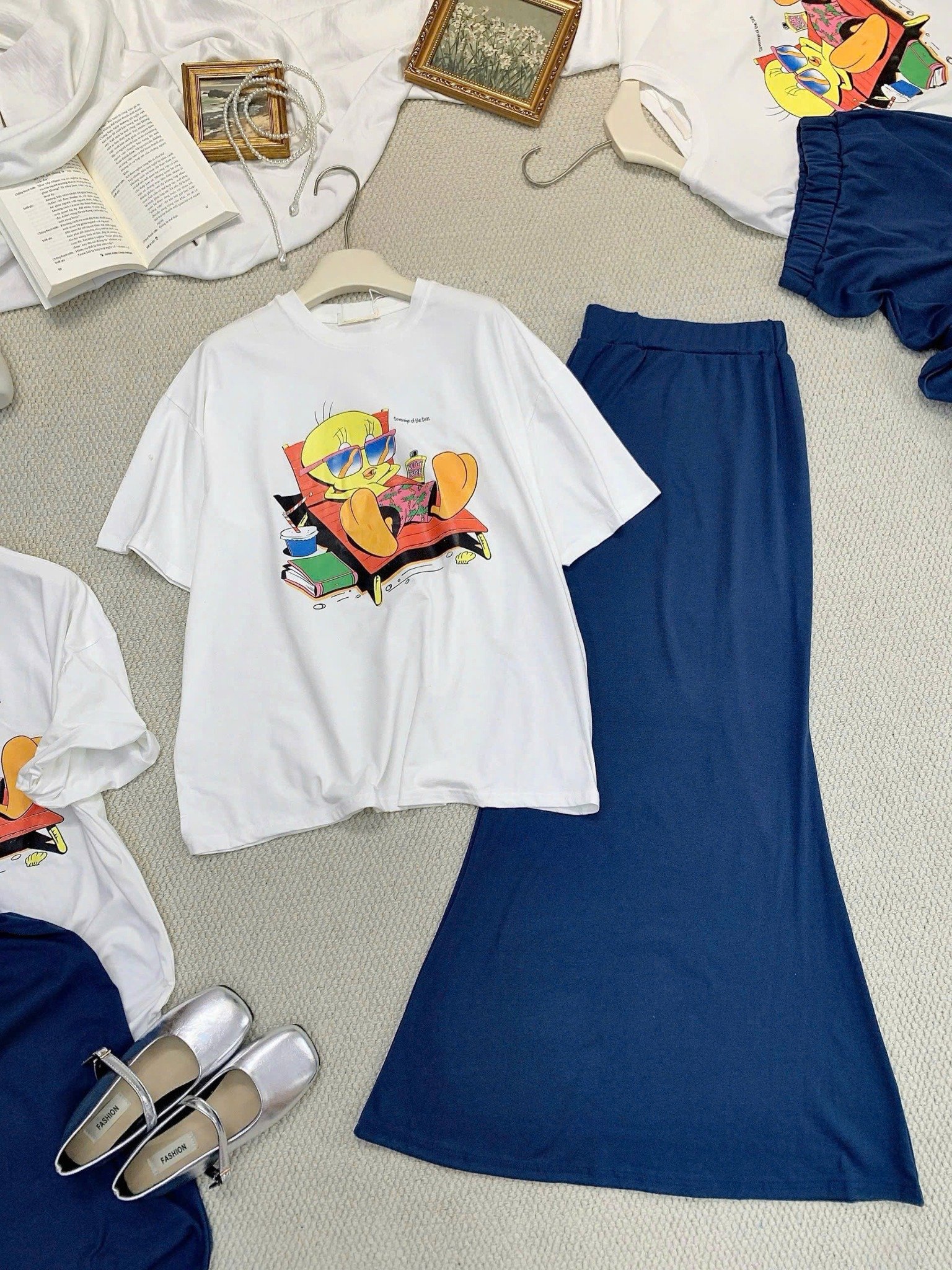 SKY7942-Set áo thun trắng in hình, CV dài Xanh