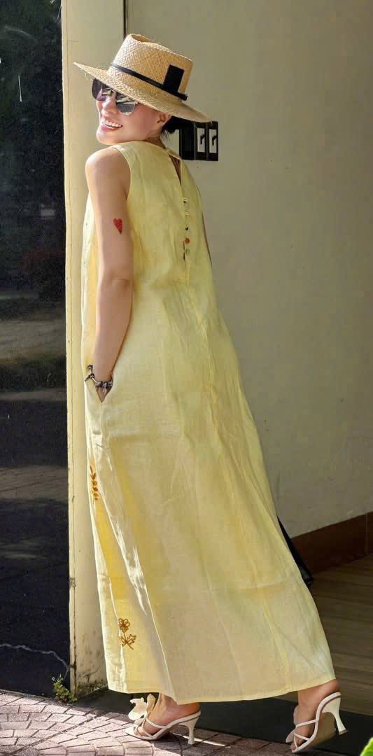 SKY9710 - ĐẦM LINEN SÁT NÁCH THÊU LÁ (VÀNG)