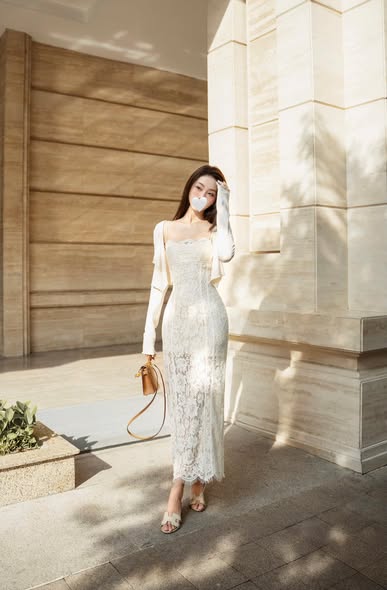 SKY9986 - SET ÁO KHOÁC + ĐẦM REN 2 DÂY (KEM)
