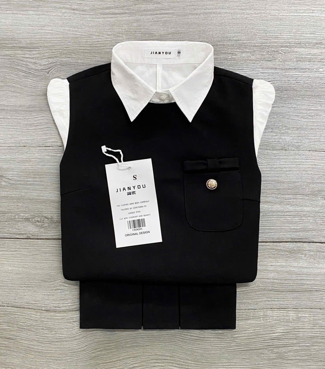 Size S: áo ngoài ngực 90, dài 42, váy eo 66, dài 38, áo sơ mi ngực 90, dài 58