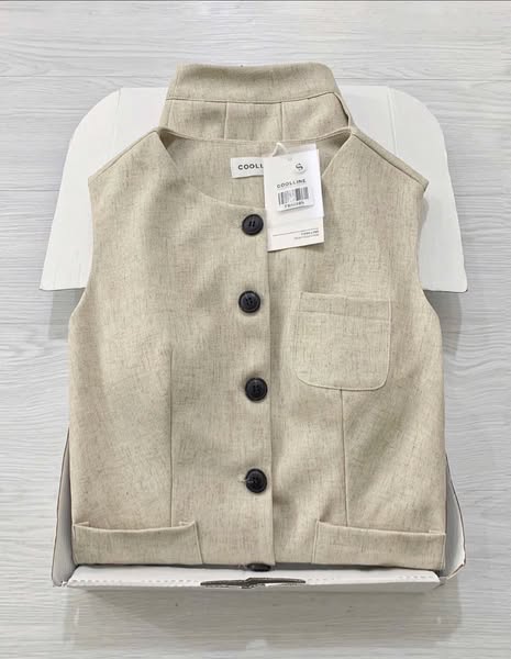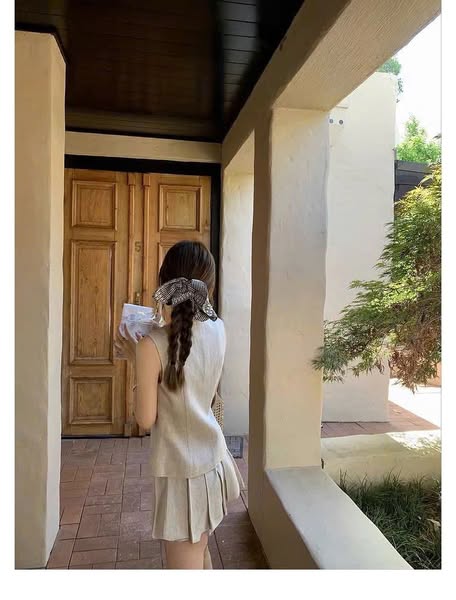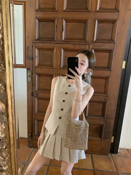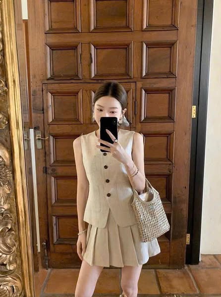 TB5810 - SET ÁO SÁT NÁCH PHỐI NÚT + CHÂN VÁY XẾP LY (MÀU DA)