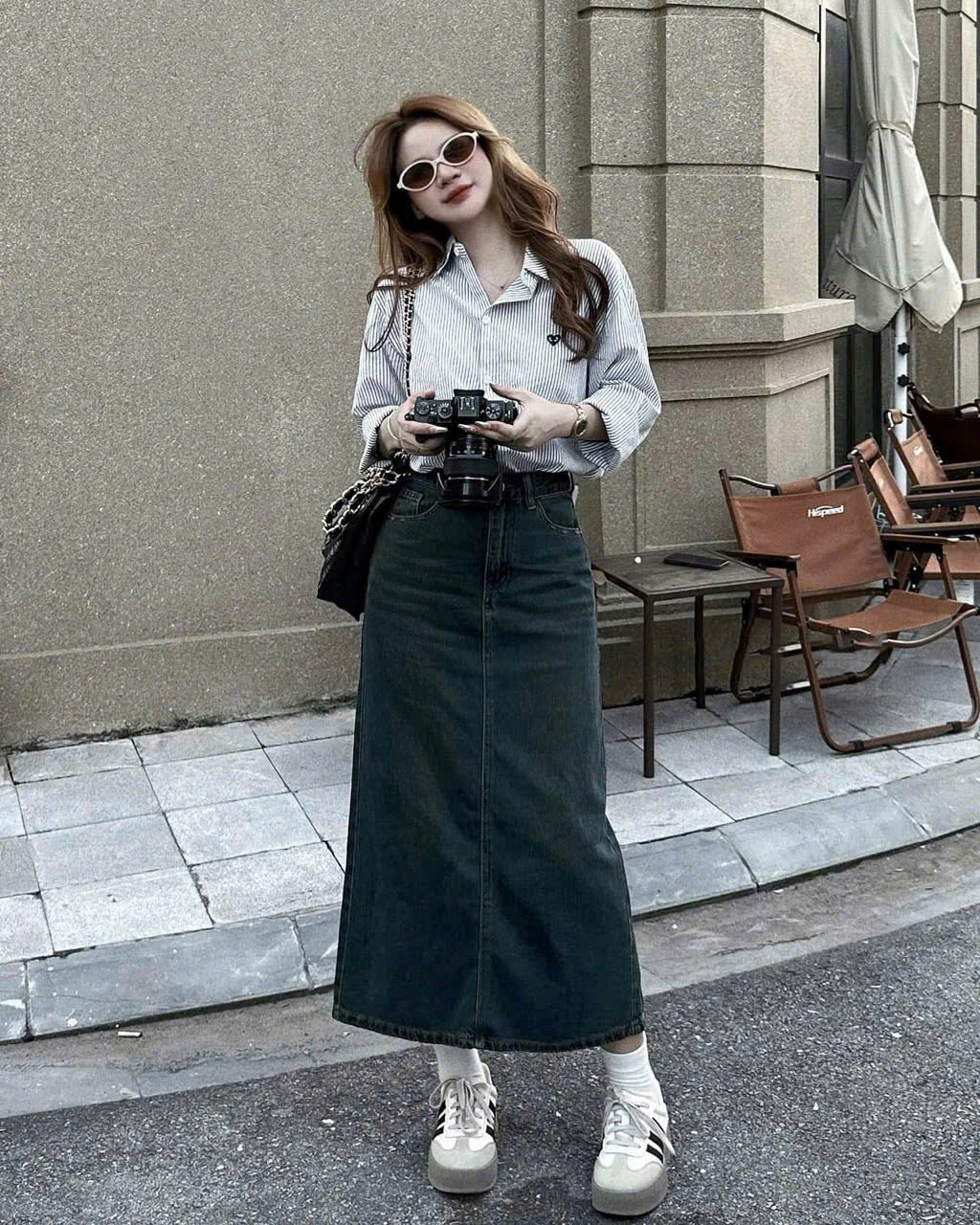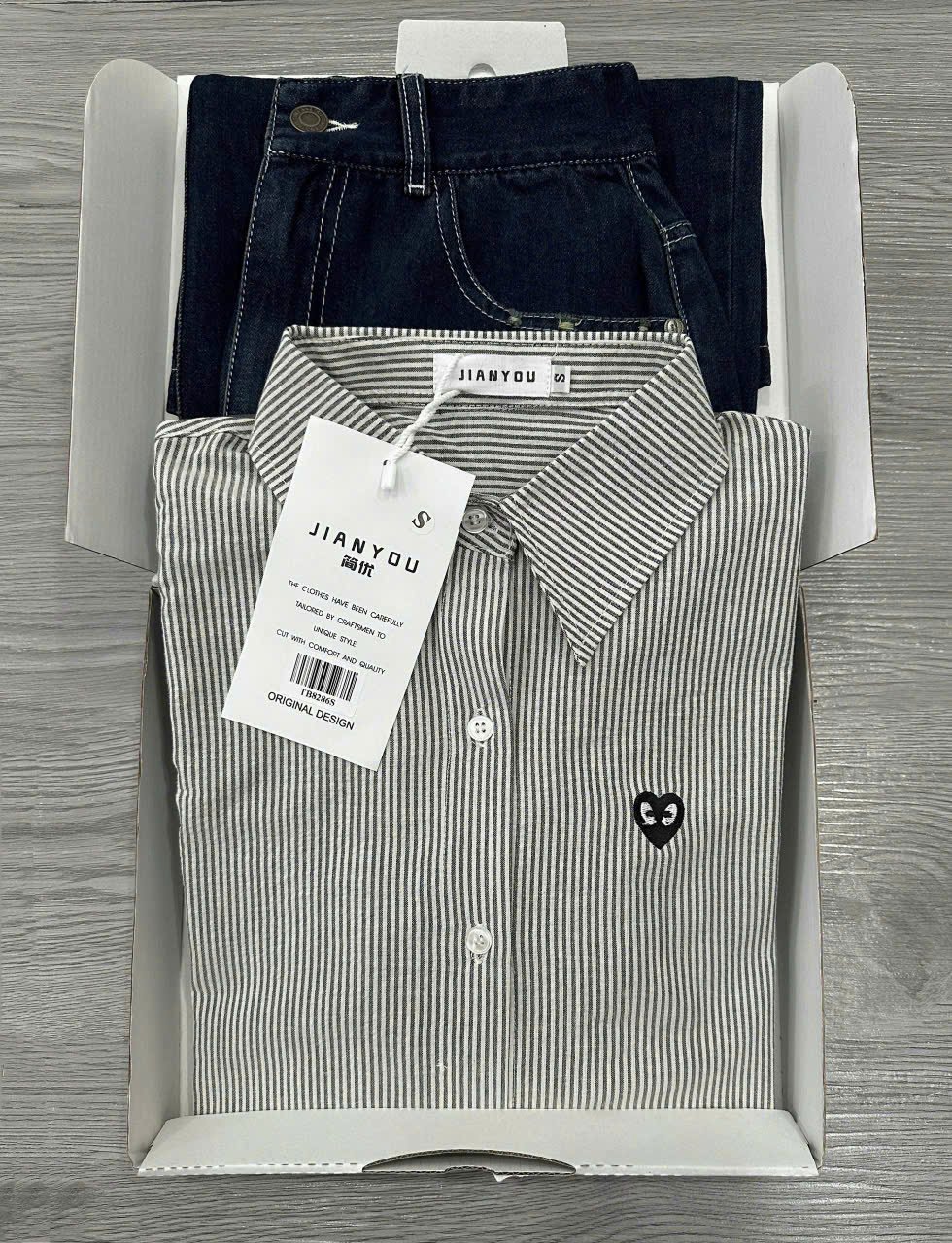 TB8286-Set áo sơ mi sọc thêu tim, CV jean CC