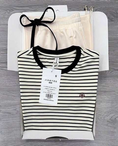 TB8363-Set áo thun sọc ngang thêu cún, quần dài ống rút dây Kem