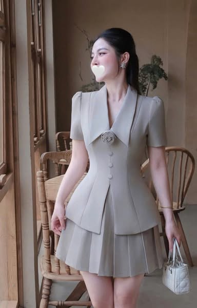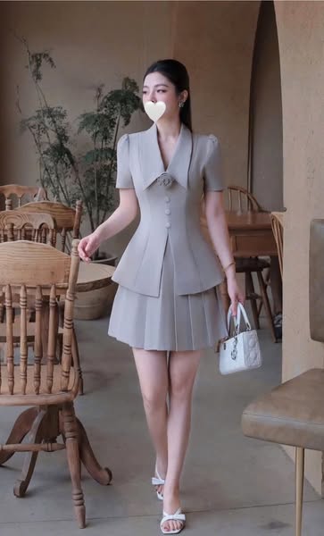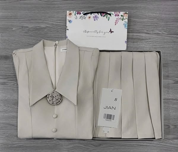 TB9223 - SET CAO CẤP PHỐI HOA, VÁY NGẮN XẾP LY - MÀU BE