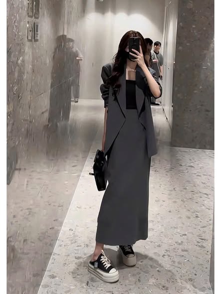 TB9507 - SET ÁO VEST, VÁY DÀI XÁM (KHÔNG KÈM ÁO TRONG)