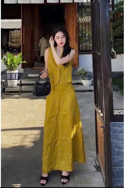 VGU9483-Đầm maxi cổ yếm đính hoa Vàng
