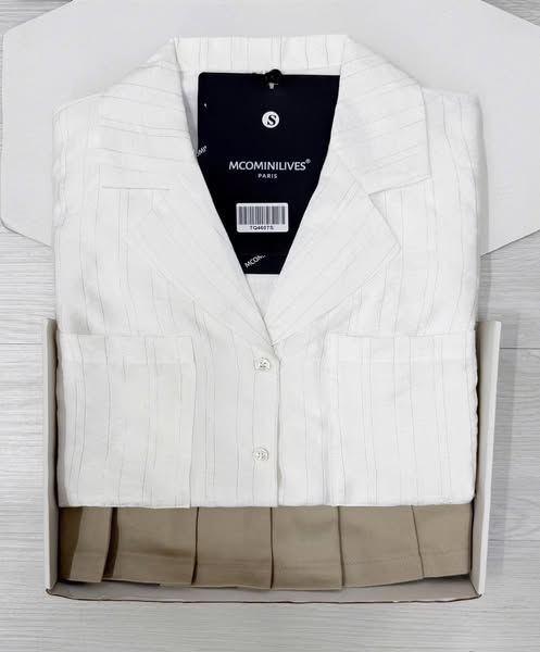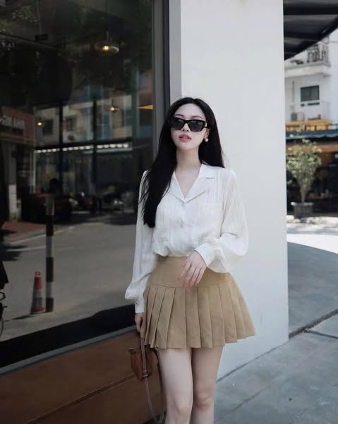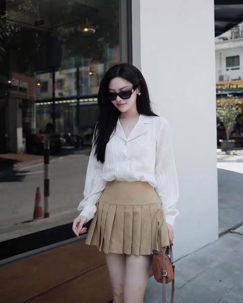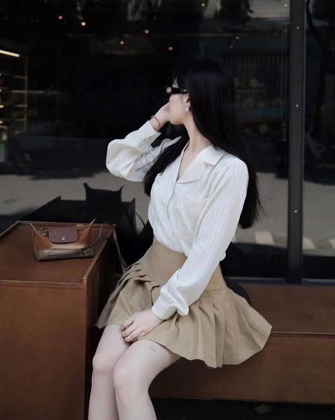 TQ4607 - SET ÁO SƠMI TAY DÀI SỌC + CHÂN VÁY XẾP LY NÂU