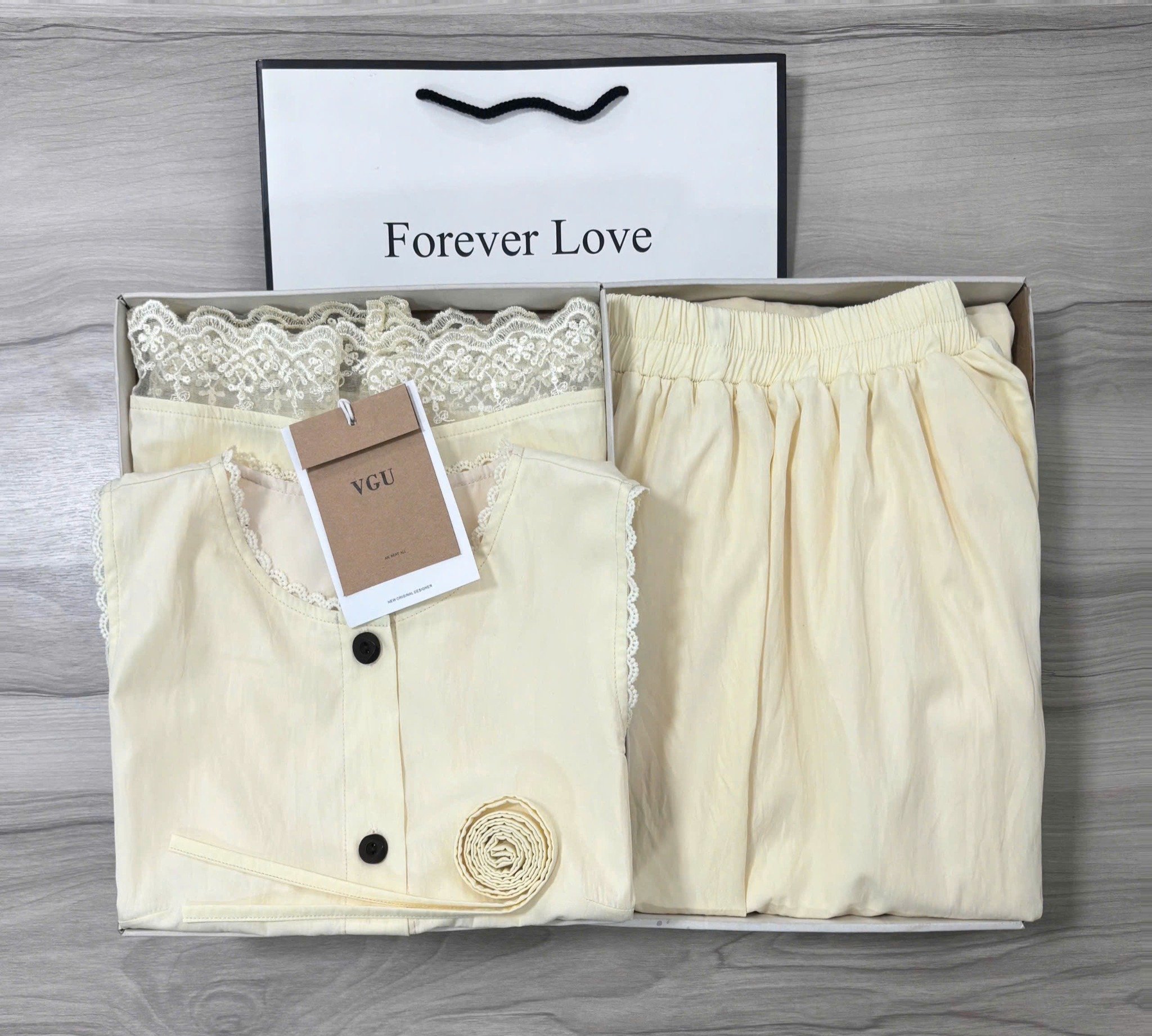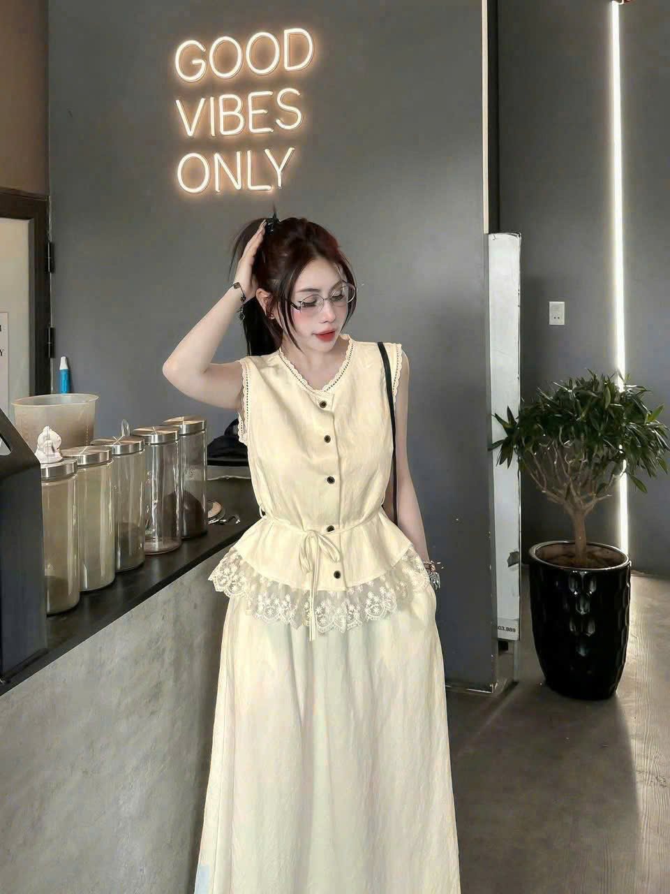 VGU0417-Set áo sát nách phối viền ren, CV dài Kem Vàng (kèm dây cột eo)