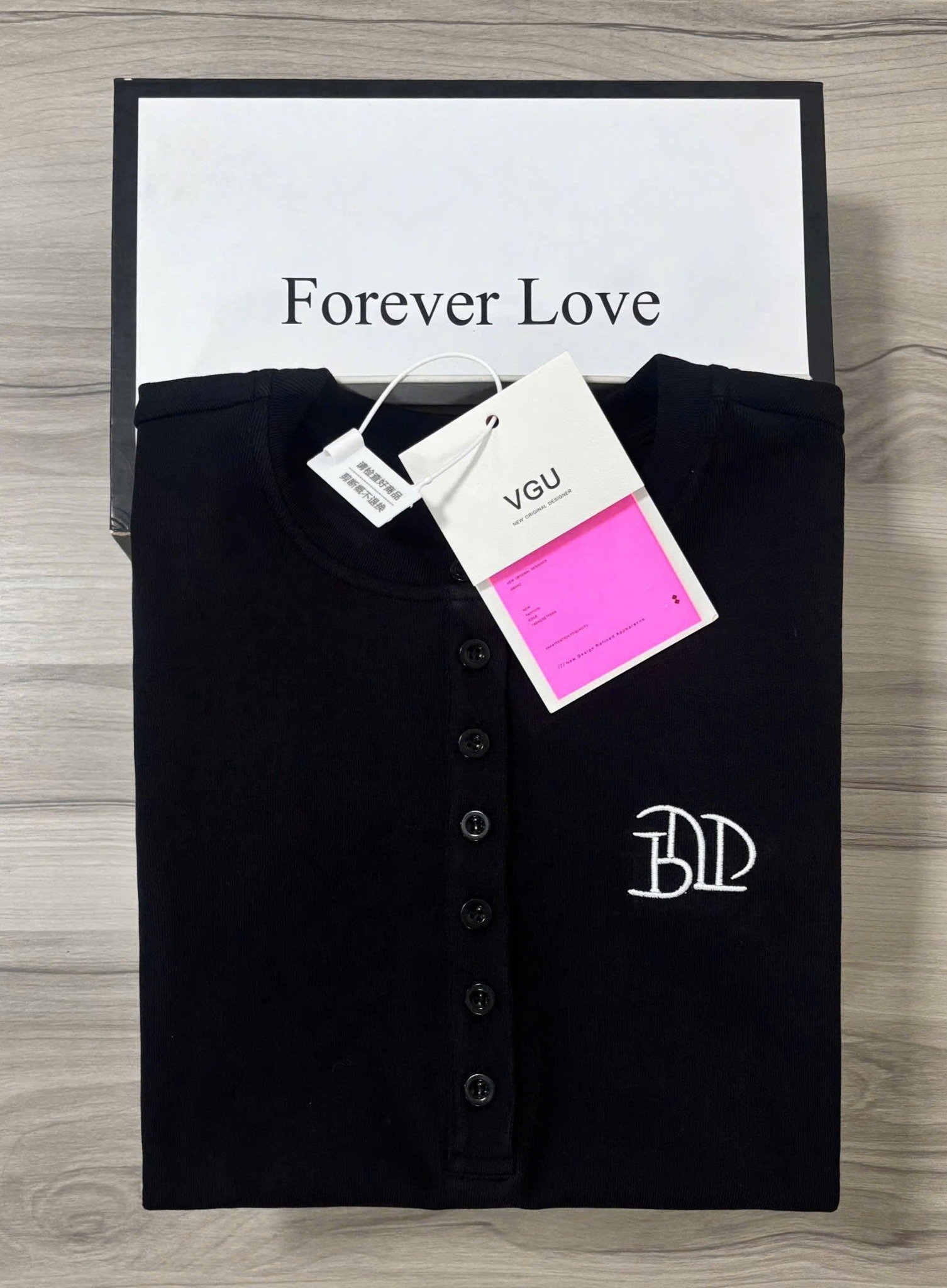 VGU0442 - ÁO THUN THÊU CHỮ PHỐI NÚT ĐEN