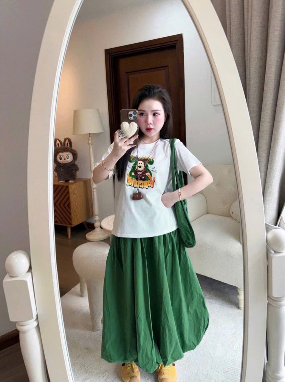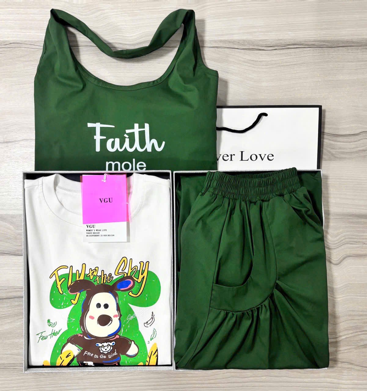 VGU0748 - SET ÁO THUN TRẮNG IN HÌNH CÚN + C.VÁY BÍ XANH KÈM TÚI (3 MÓN)