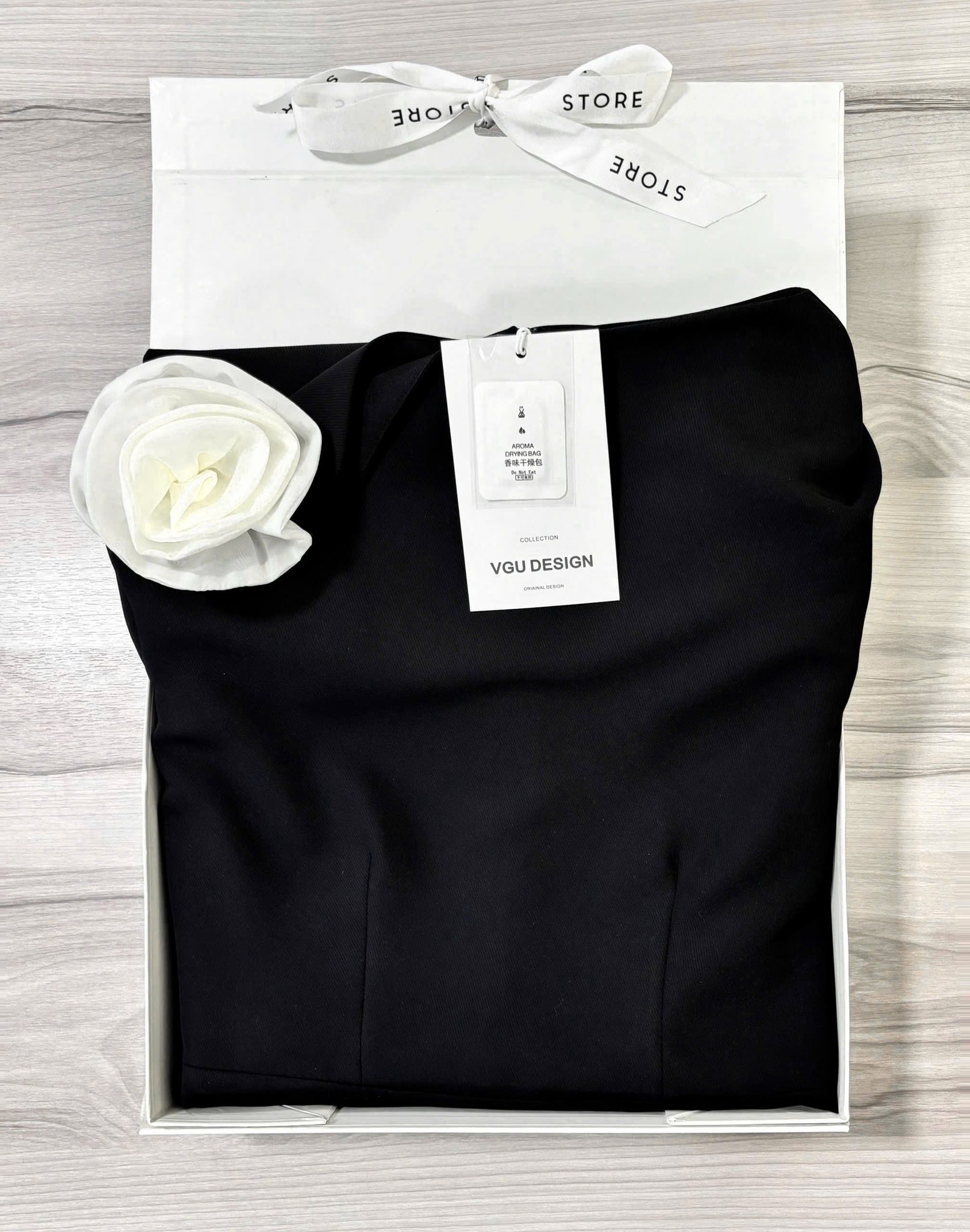VGU1164 - ĐẦM DÀI TRỄ VAI ĐEN (KÈM TAG HOA)