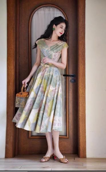 VGU1179 - ĐẦM DÀI XÒE CỔ TIM HỌA TIẾT MÀU (KÈM NỊT)