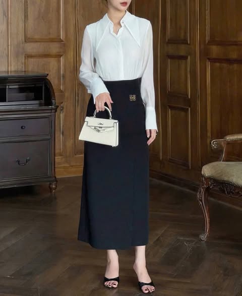 TB7583 SET ÁO CỔ VUÔNG CHÂN VÁY DÀI (ĐEN)