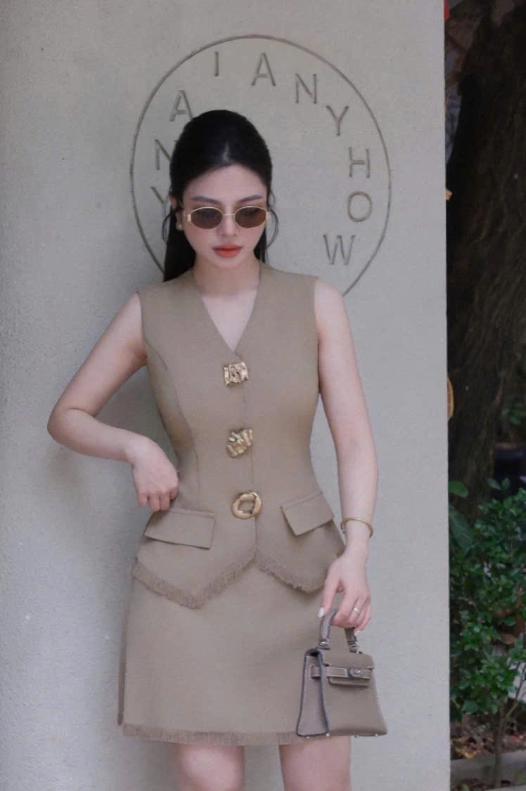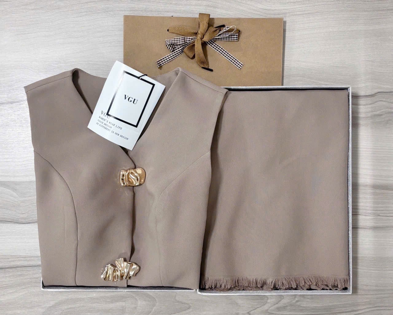 VGU1277 - SET ÁO GILE PHỐI TAG + CHÂN VÁY TÀ TUA RUA (NÂU)