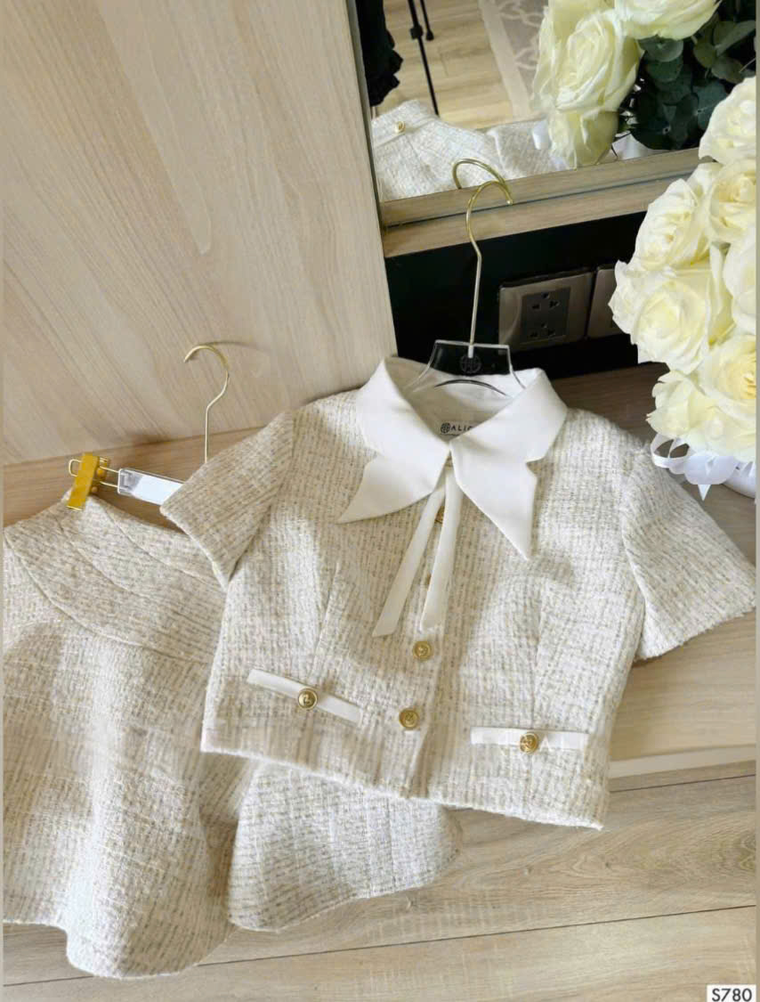 VGU1444 SET DẠ CỔ CÁNH BƯỚM - CHÂN VÁY NGẮN