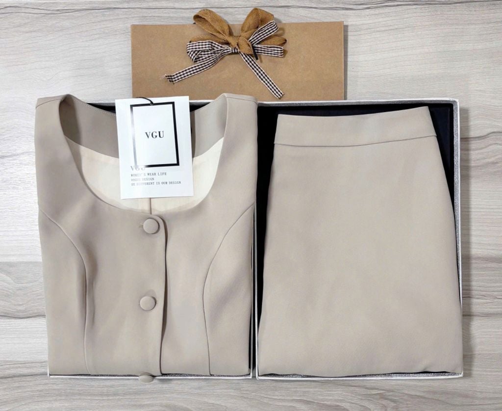 VGU1463 SET ÁO ĐÍNH NƠ NÚT BỌC - CHÂN VÁY NGẮN (DA)