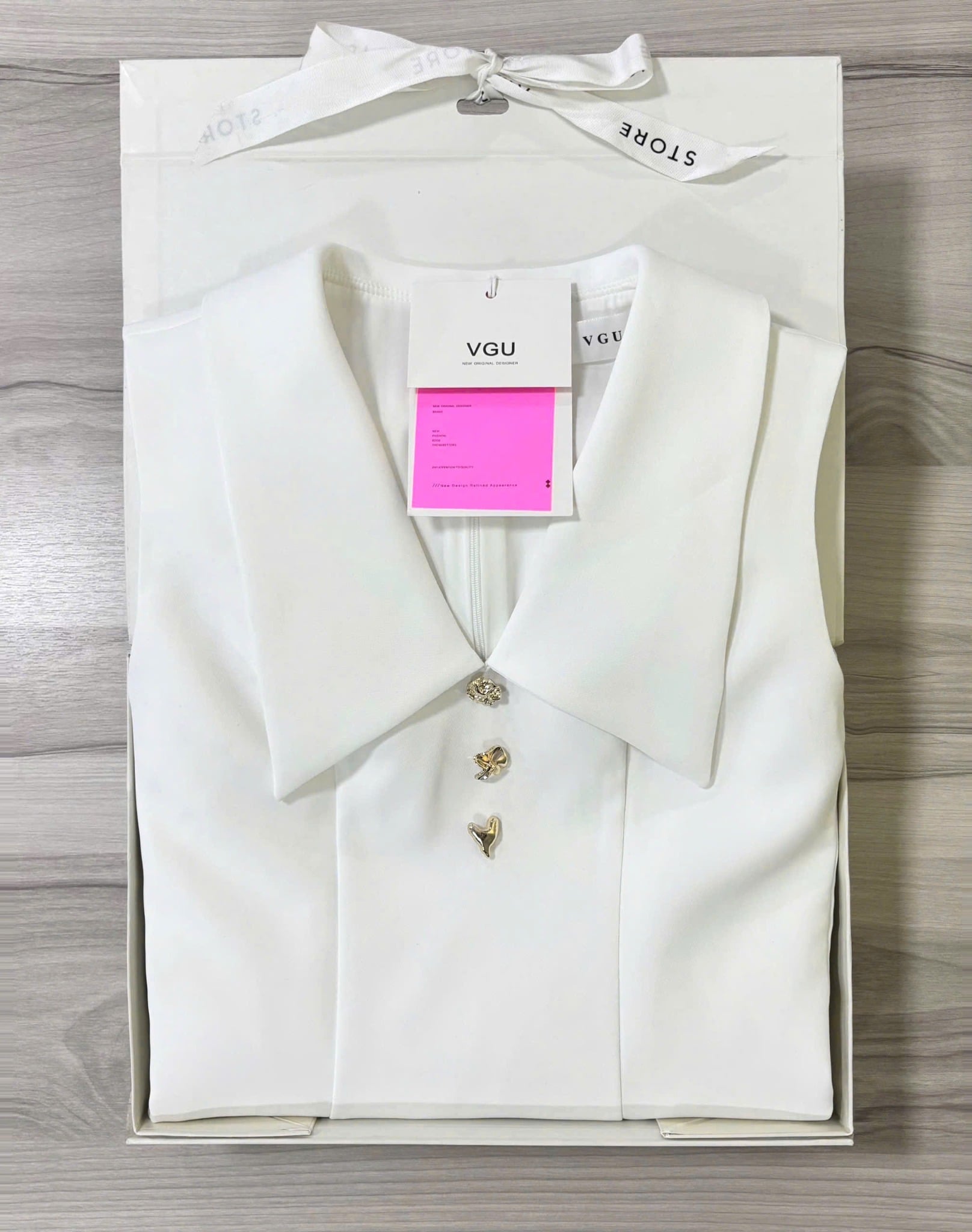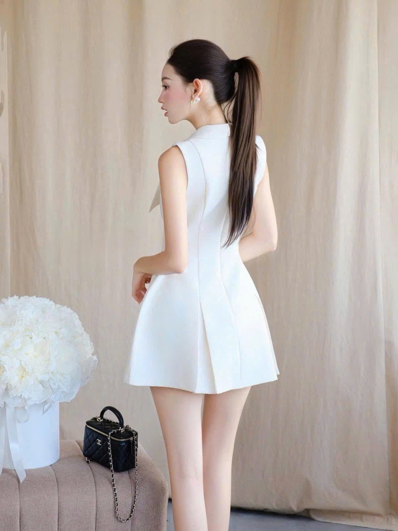 VGU1469 ĐẦM NGẮN SÁT NÁCH CỔ NHỌN ĐÍNH NÚT (TRẮNG)