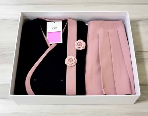 VGU1732 - SET ÁO KHOÁC VEST + C.VÁY XẾP LY + DÂY CHOÀNG + TAG HOA (HỒNG PHỐI ĐEN)