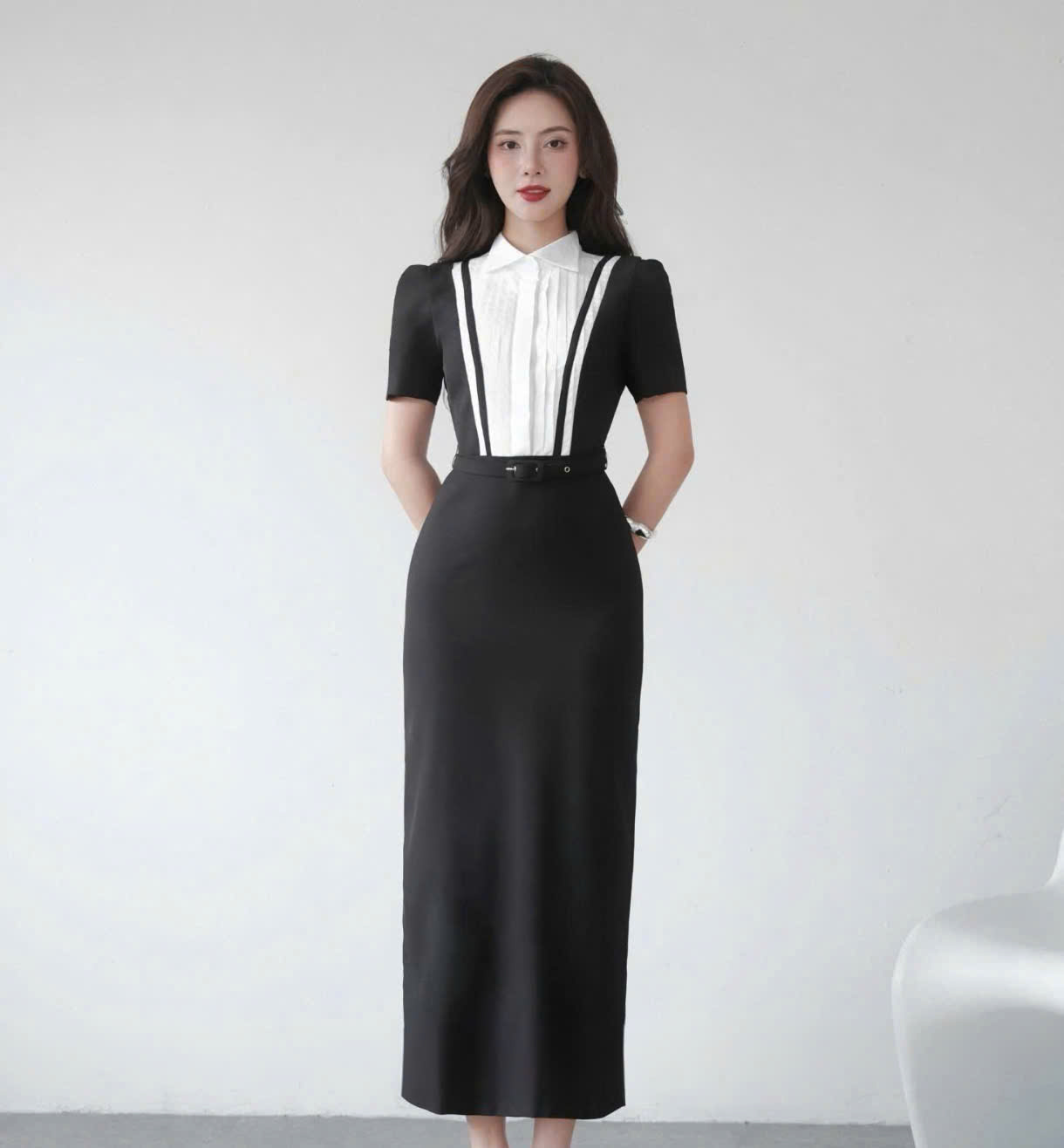 TB7583 SET ÁO CỔ VUÔNG CHÂN VÁY DÀI (ĐEN)