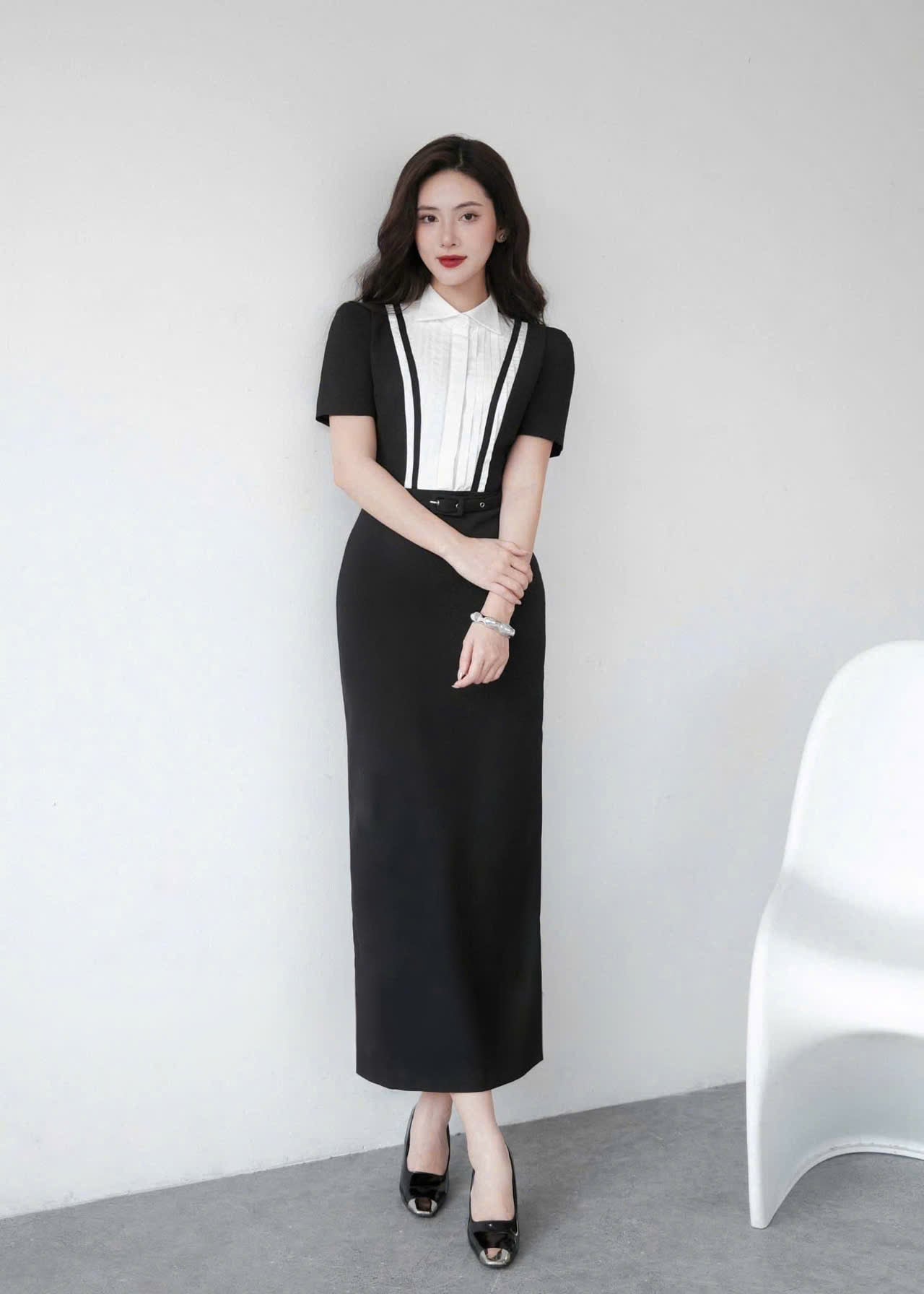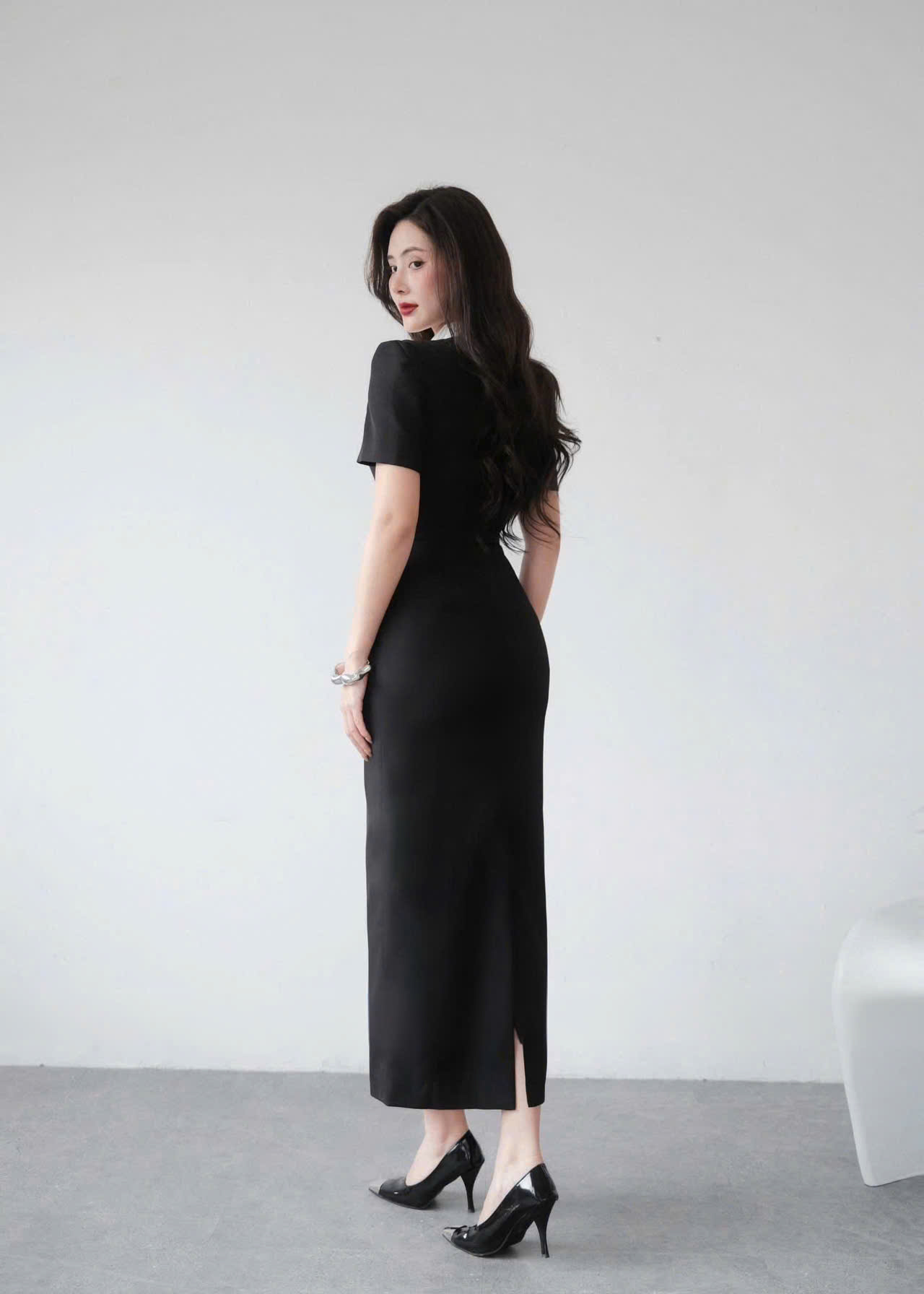 VGU1779 ĐẦM DÀI ĐEN TK CỔ SƠMI XẾP LI