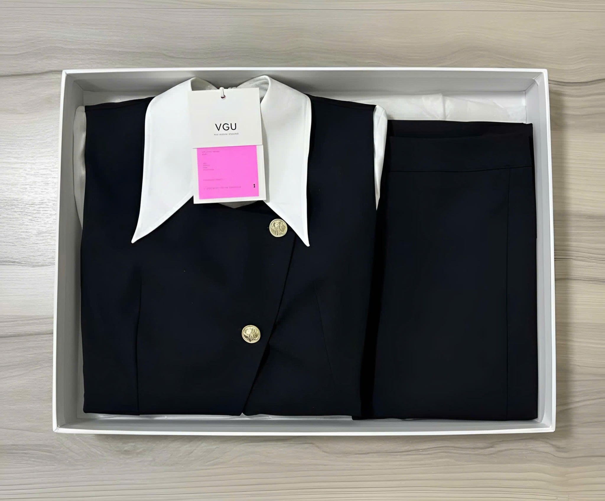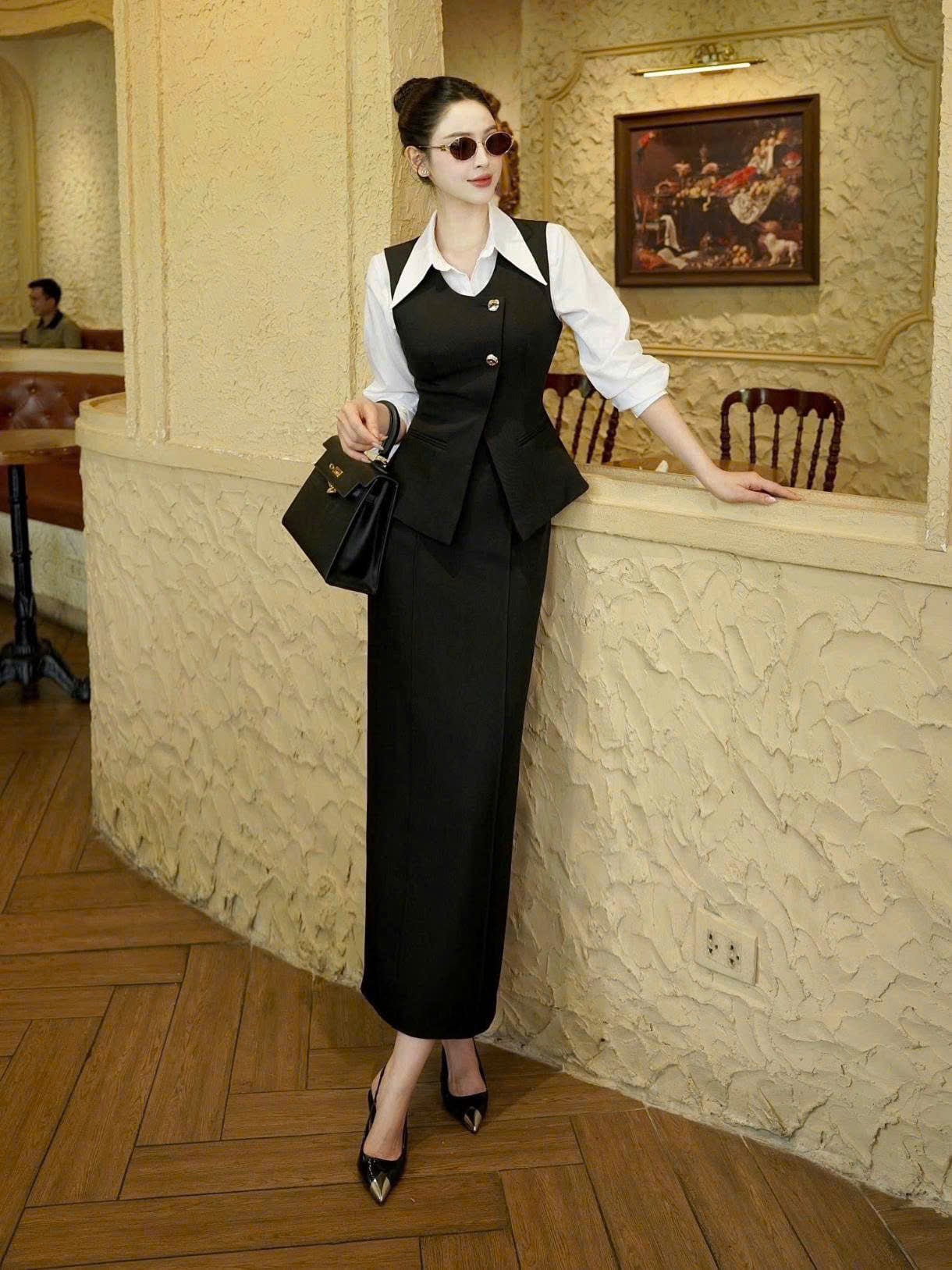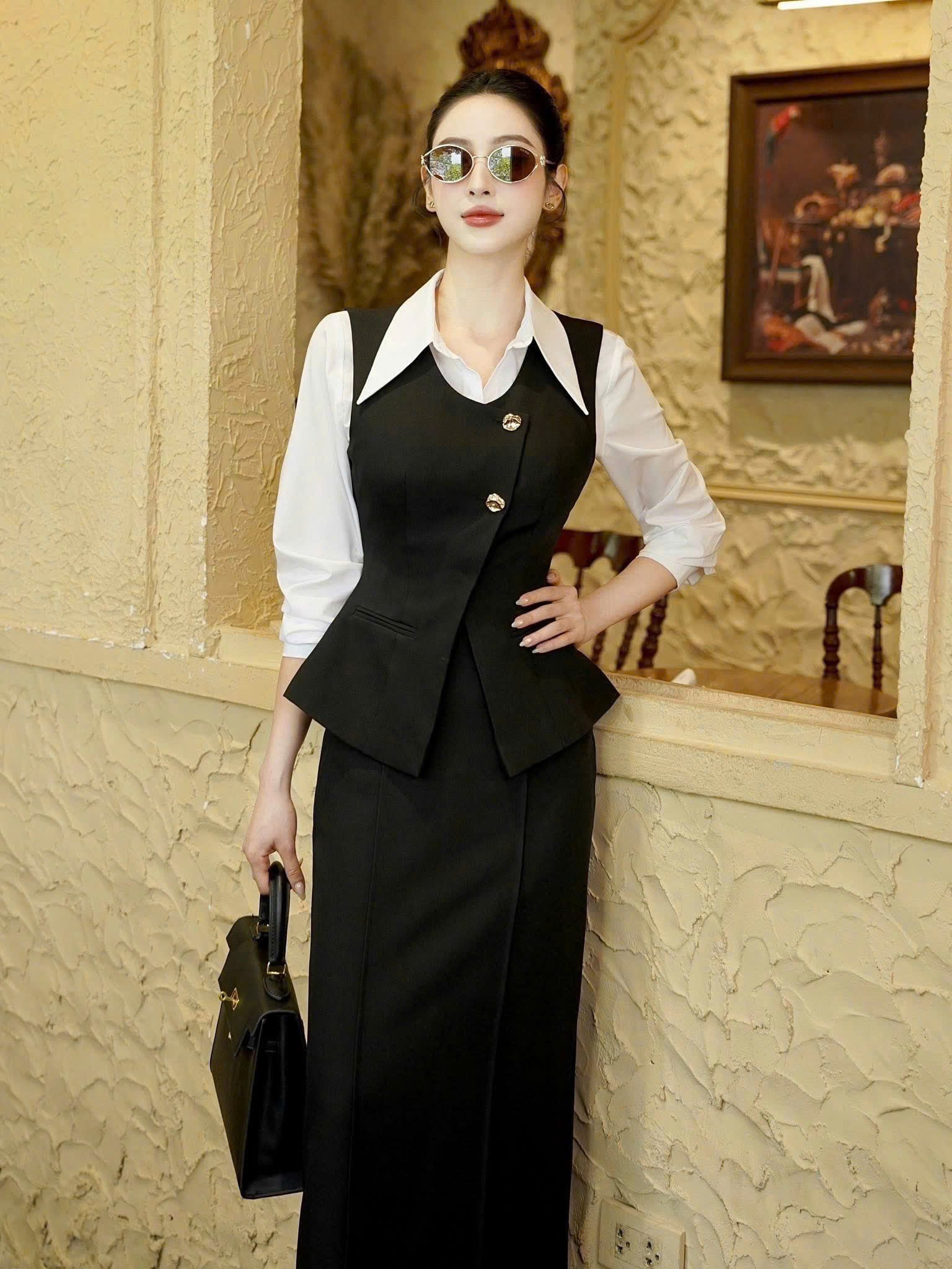 SIZE L : NGỰC ÁO SƠ MI 98 : DÀI ÁO 64 : NGỰC ÁO NGOÀI 94 : DÀI ÁO 62 : EO VÁY 74 : DÀI VÁY 84CM