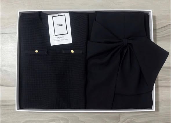 VGU2298 - SET ÁO LƯỚI TAY DÀI, VÁY DÀI ĐÍNH NƠ EO (ĐEN)
