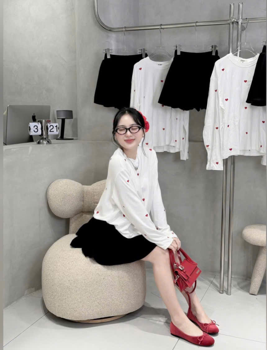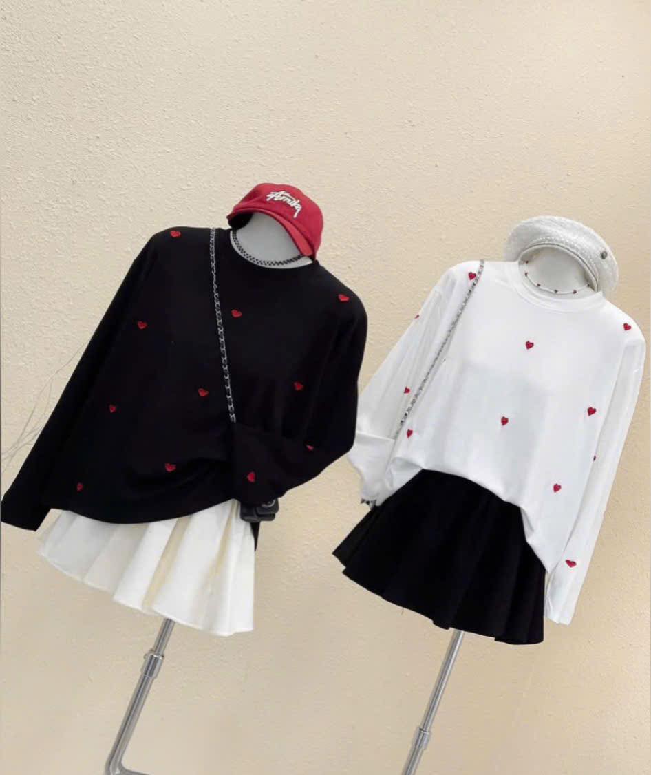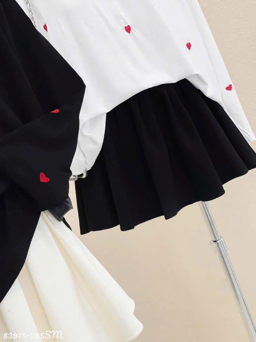 VGU9635-Set thun áo tay dài thêu tim , CV xếp ly Đen (áo Trắng)