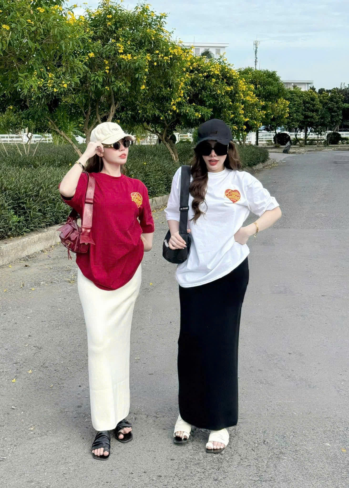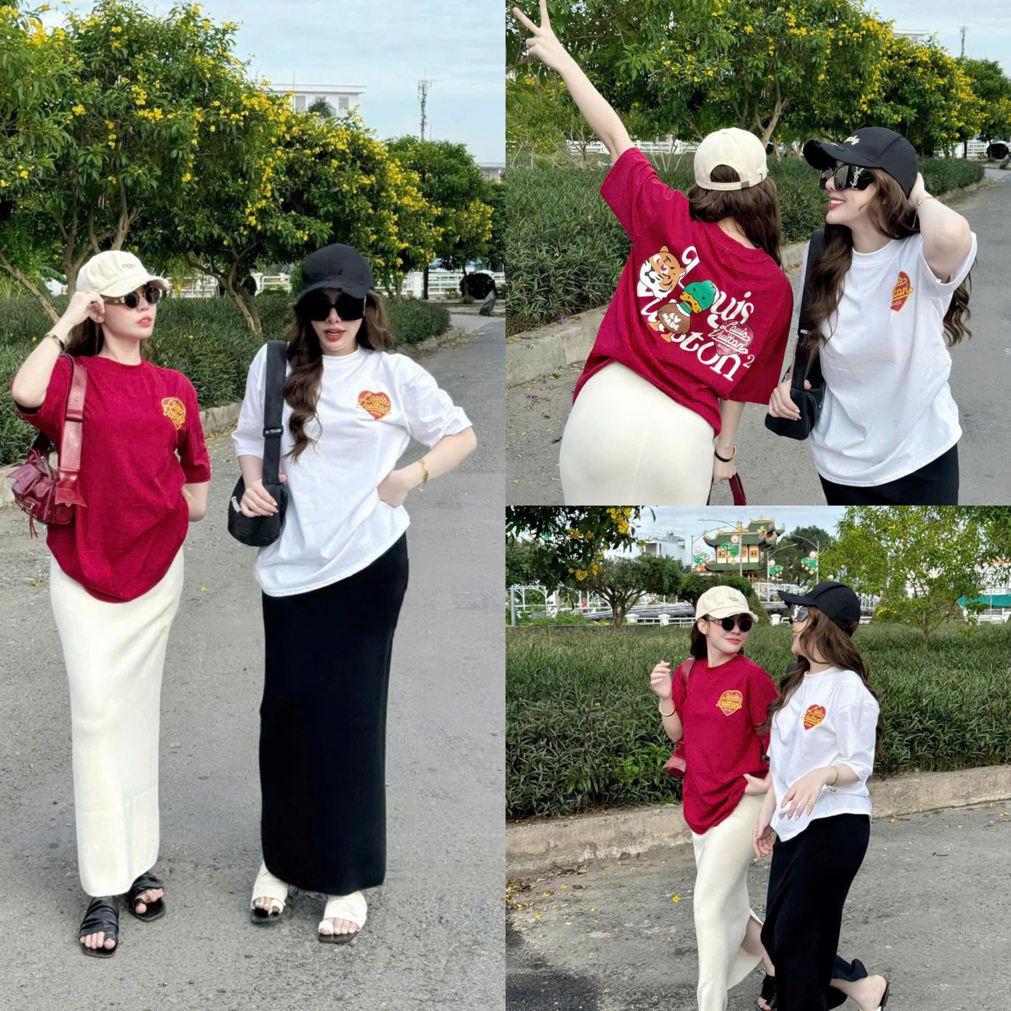 VRA0327-Set QC áo thun đỏ in tim, CV dài Kem