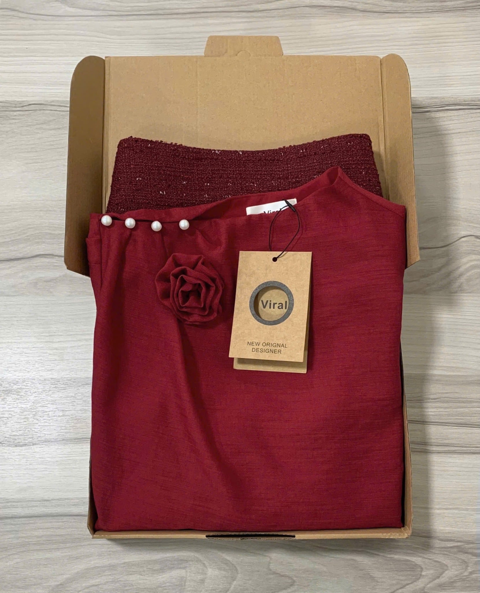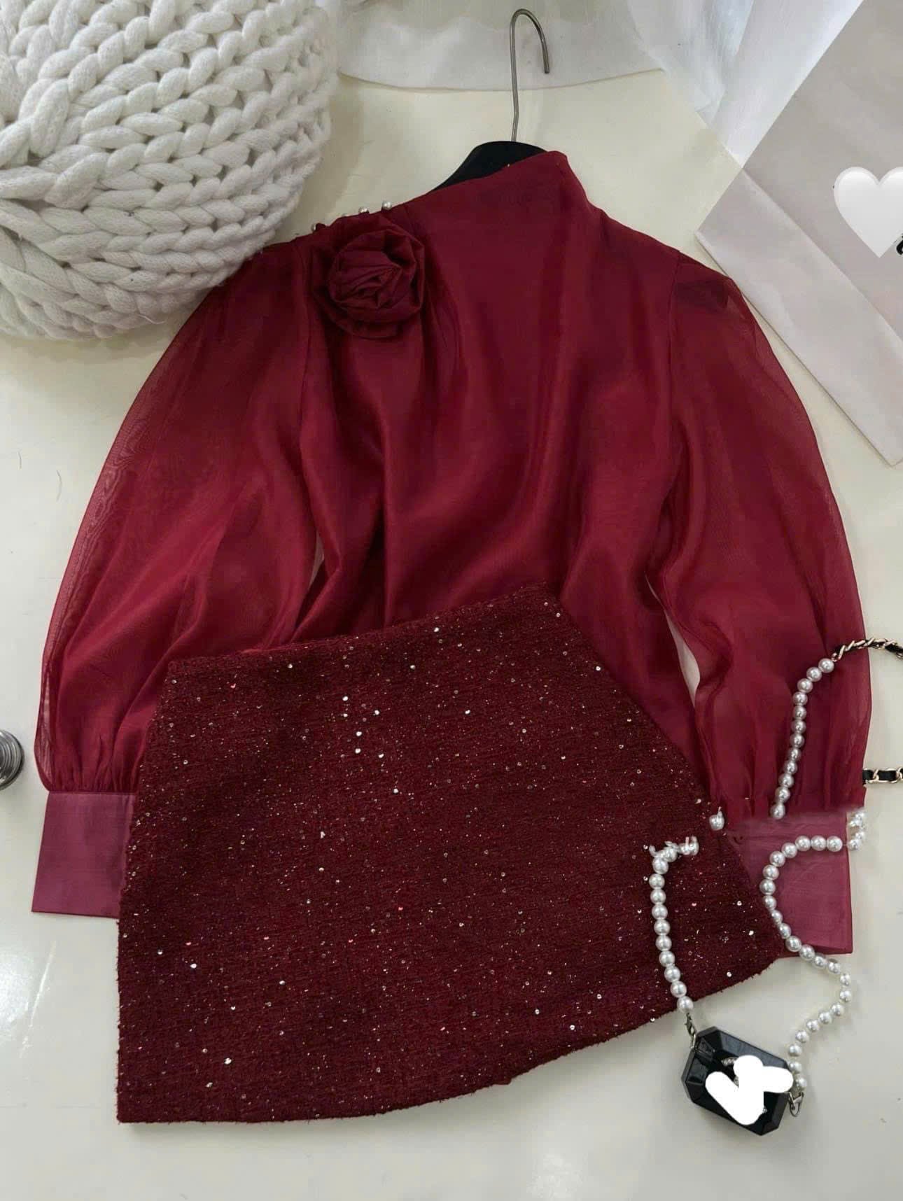 VRA0334 - Set áo voan tag hoa + Chân váy đỏ